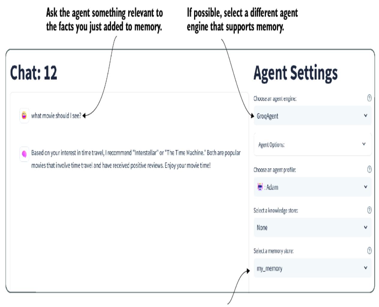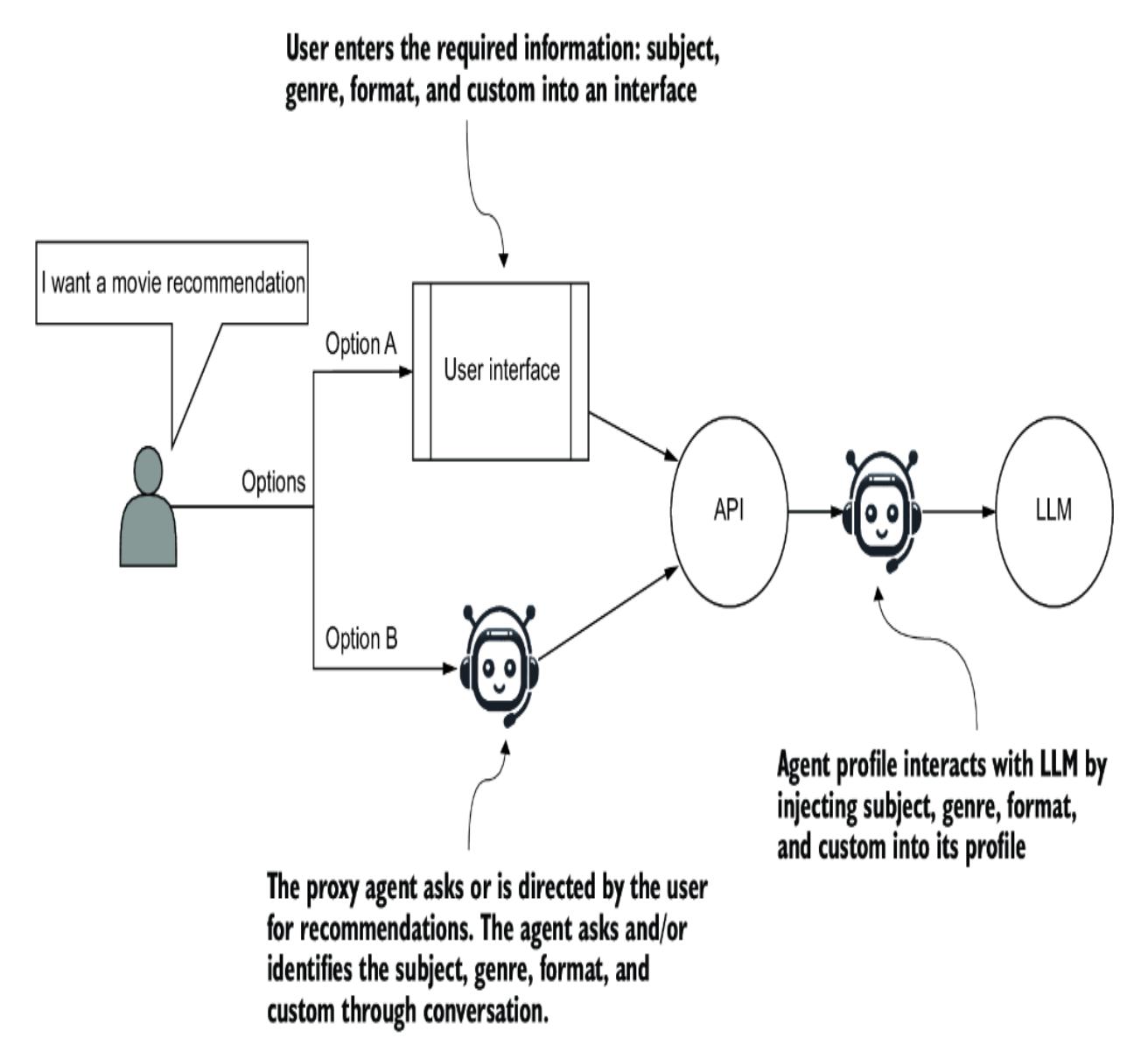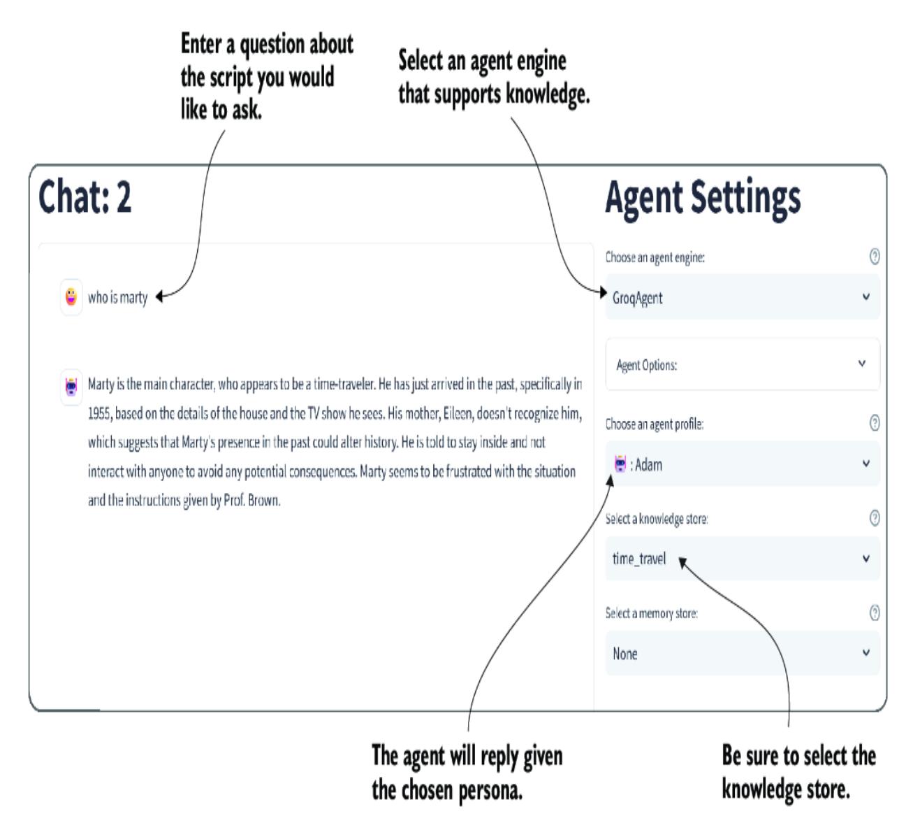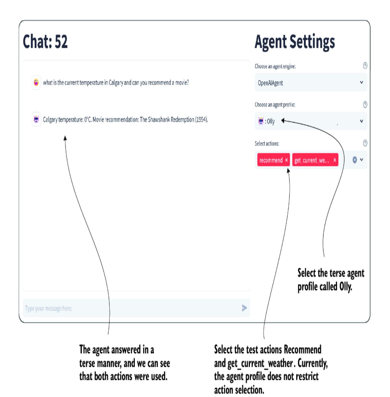 In addition to the standard features of an LLM chat application, Nexus allows the user to configure an agent to use a specific API/model, the persona, and possible actions. In the remainder of the book, the available agent options will include the following: