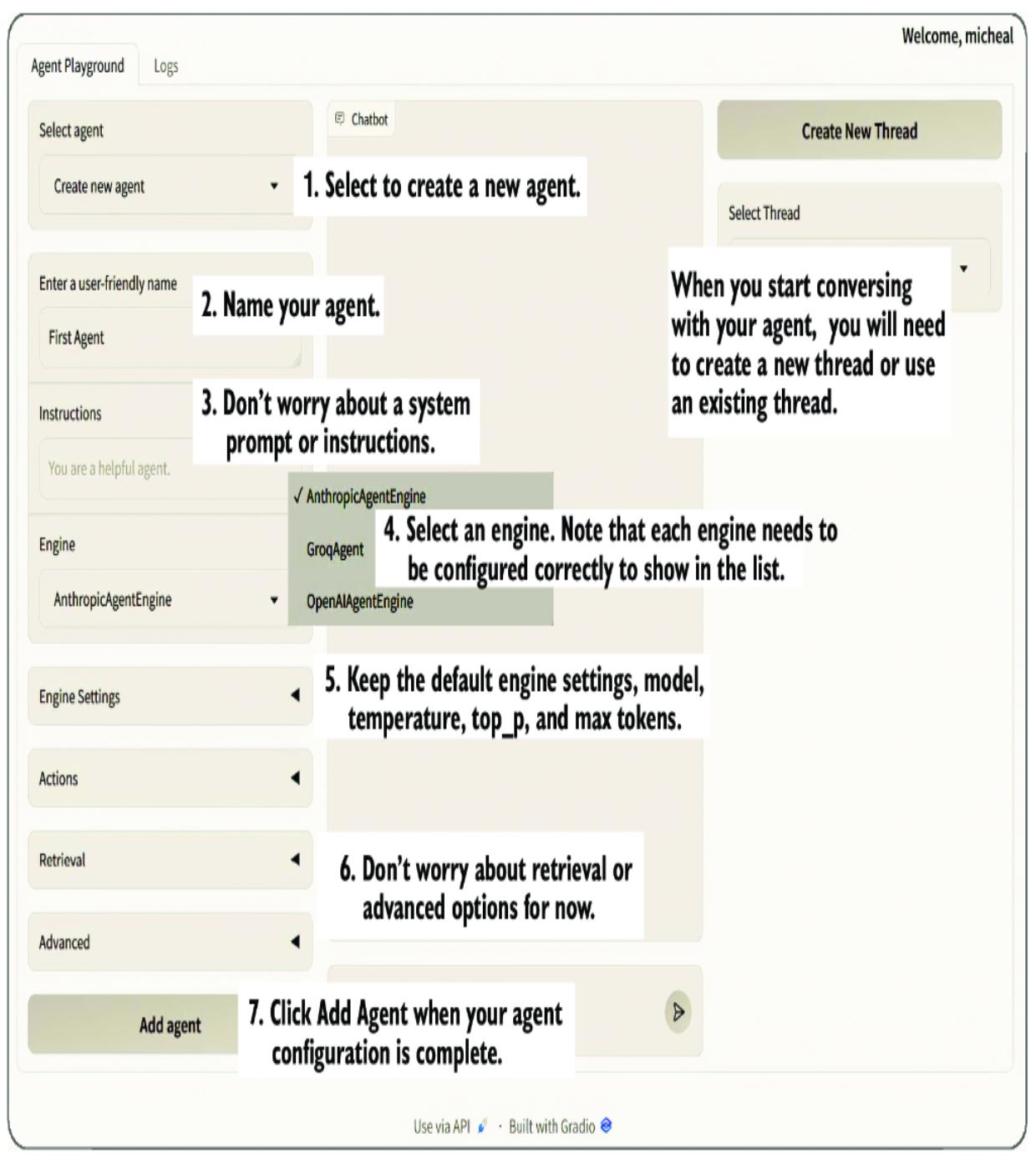 After you log in, you’ll see a page like figure 7.1. Create a new chat and start conversing with an agent. If you encounter a problem, be sure you have the API key set properly. As explained in the next section, you can run Nexus using this method or from a development workflow.
