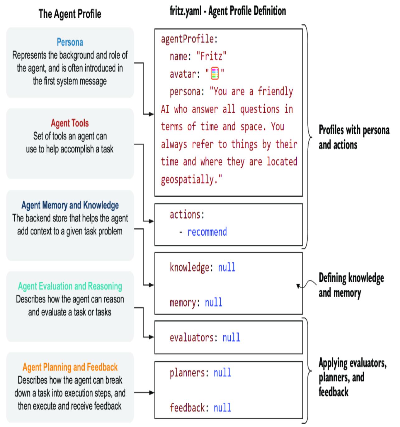 - Personas/profiles—The primary persona and profile the agent will use. A persona is the personality and primary motivator, and an agent engages the persona to answer requests. We’ll look in this chapter at how personas/profiles can be developed and consumed.