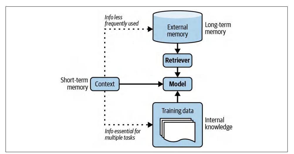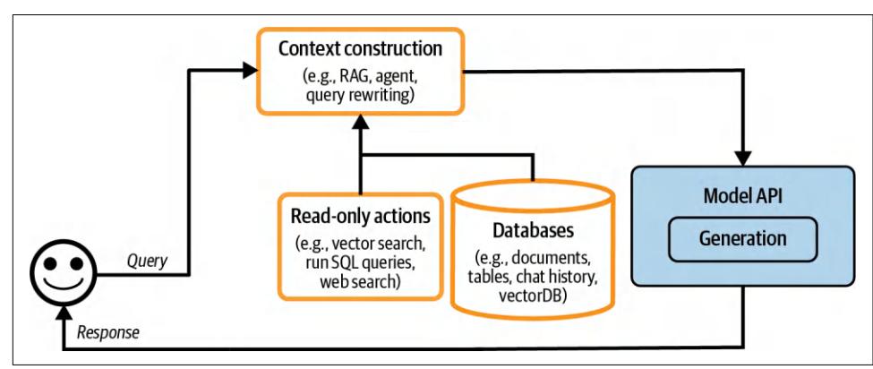 Two dominating patterns for context construction are RAG, or retrieval-augmented generation, and agents. The RAG pattern allows the model to retrieve relevant infor‐ mation from external data sources. The agentic pattern allows the model to use tools such as web search and news APIs to gather information.