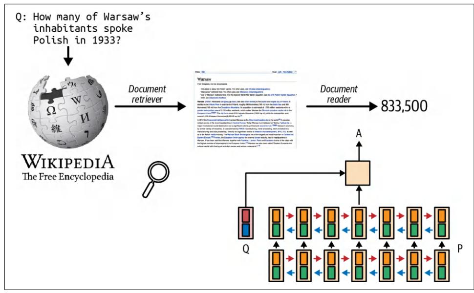 The retrieve-then-generate pattern was first introduced in “Reading Wikipedia to Answer Open-Domain Questions” (Chen et al., 2017). In this work, the system first retrieves five Wikipedia pages most relevant to a question, then a model1 uses, or reads, the information from these pages to generate an answer, as visualized in Figure 6-1.