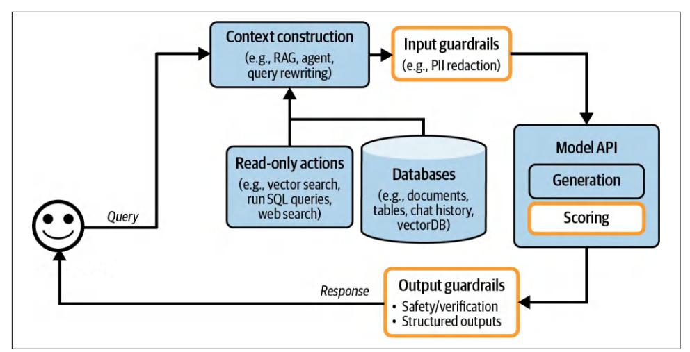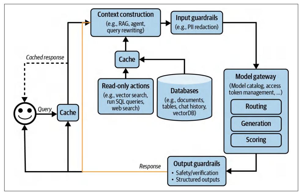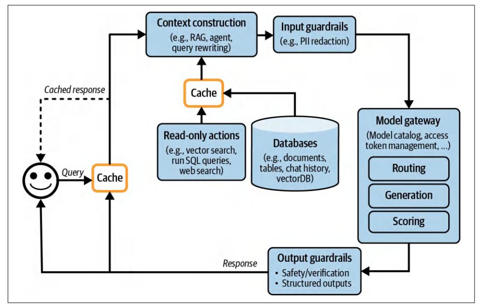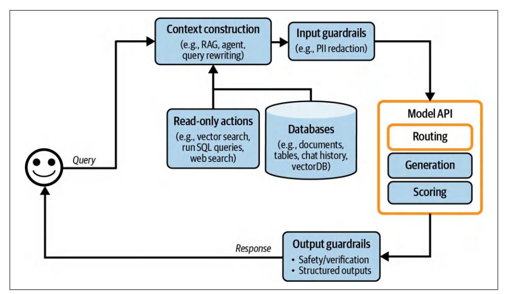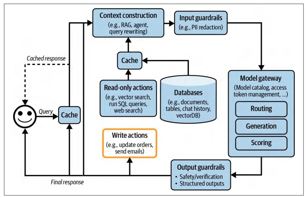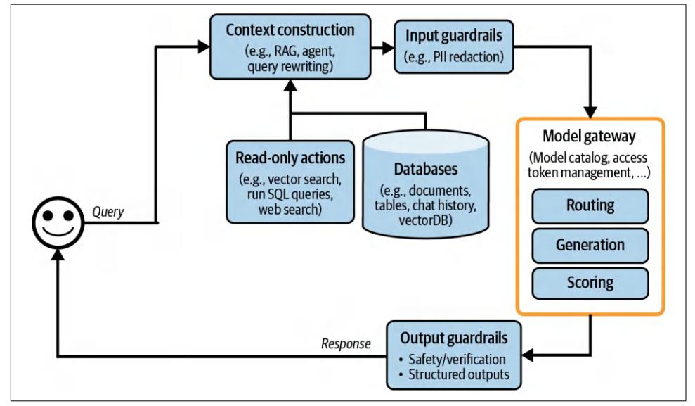 While it’s necessary to separate components to keep your system modular and main‐ tainable, this separation is fluid. There are many ways components can overlap in functionalities. For example, guardrails can be implemented in the inference service, the model gateway, or as a standalone component.