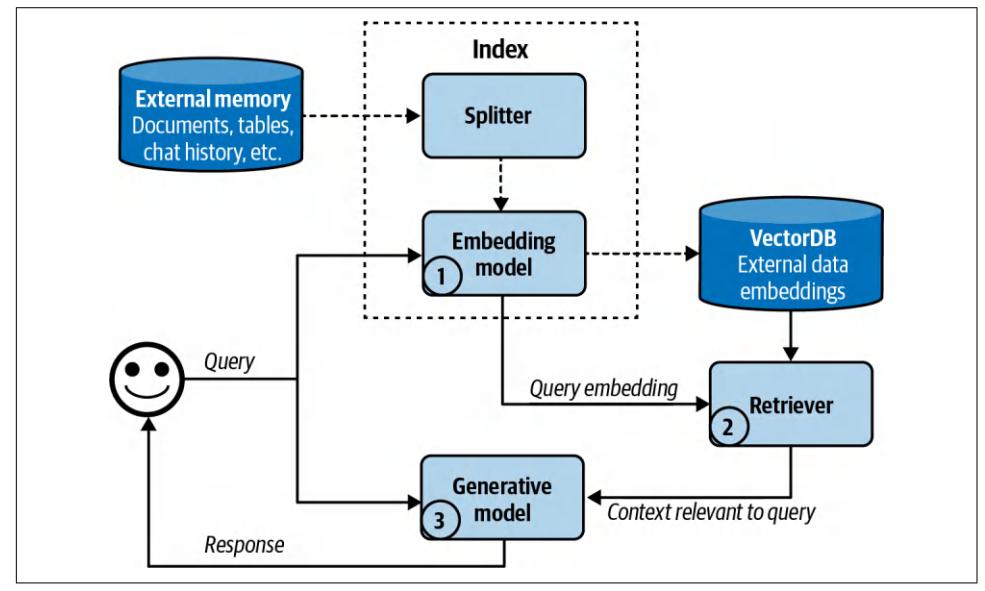 A RAG system has two components: a retriever that retrieves information from external memory sources and a generator that generates a response based on the retrieved information. Figure 6-2 shows a high-level architecture of a RAG system.
