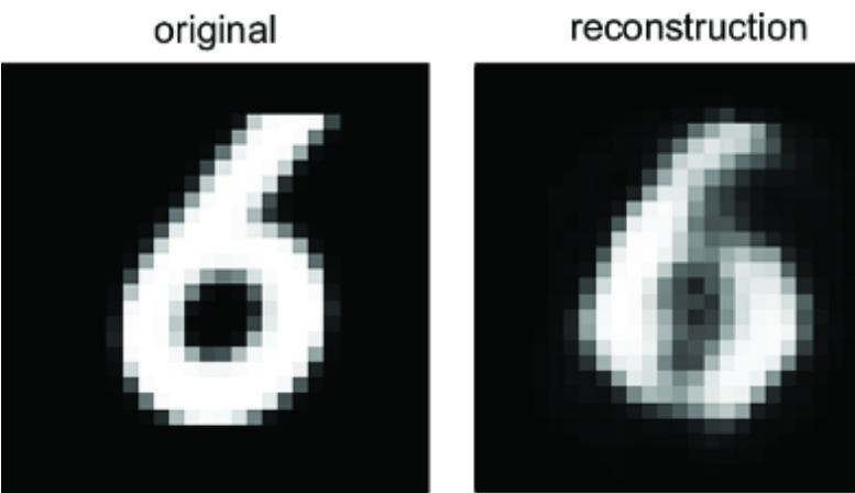 At certain points during training, we randomly choose an image and ૿ reconstruct it by passing the image thr ough the encoder to get a latent value of Z, and passing that value back thr ough the decoder . In one run, the first image I see is a non-handwritten number 6. F igure 5.12 shows this image and its r econstruction.