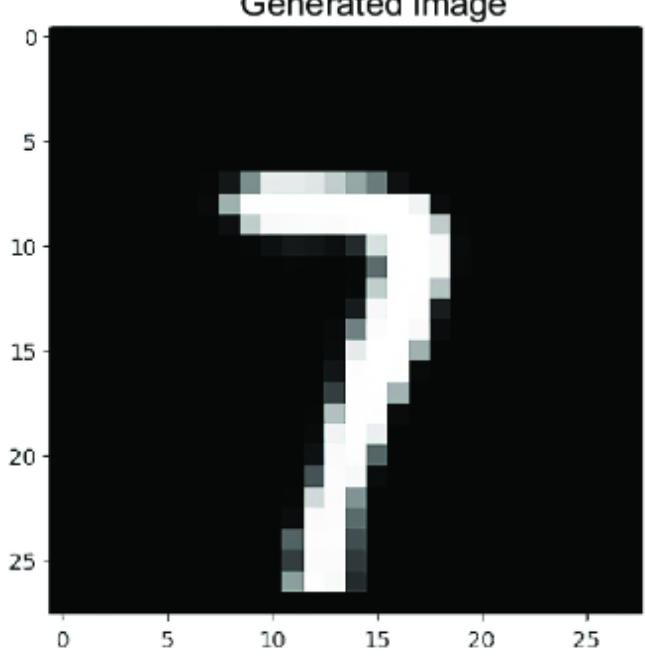 Next, I visualize how well it is perfor ming as an overall generative model by generating and plotting an image fr om scratch. I run this code once each time a certain number of epochs ar e run.
