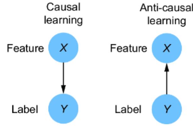 Figure 5.16 In causal learning, the features cause the label. In anticausal learning, the label causes the features.