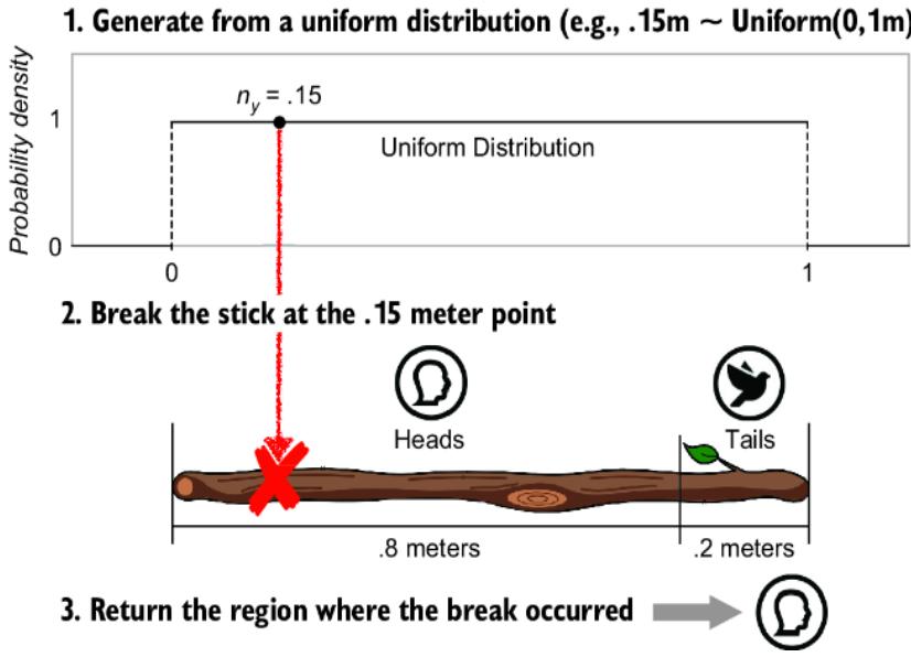 Recall from chapter 2 that x ~ P (X ) and y ~ P (Y |X=x ) means we generate from the probability distribution of X and conditional probability distribution of Y given X. In this case, P (X ), the distribution of femur length, represented as a normal distribution with a mean of 47 centimeters and a standard deviation of 2.3 centimeters. P (Y |X=x ) is the distribution on height given the femur length, given as a normal distribution with a mean of 25 + 3x centimeters and a standard deviation of 3.3 centimeters. We would implement this model in Pyro as follows in listing 6.1.