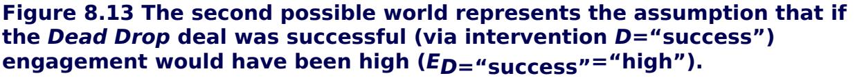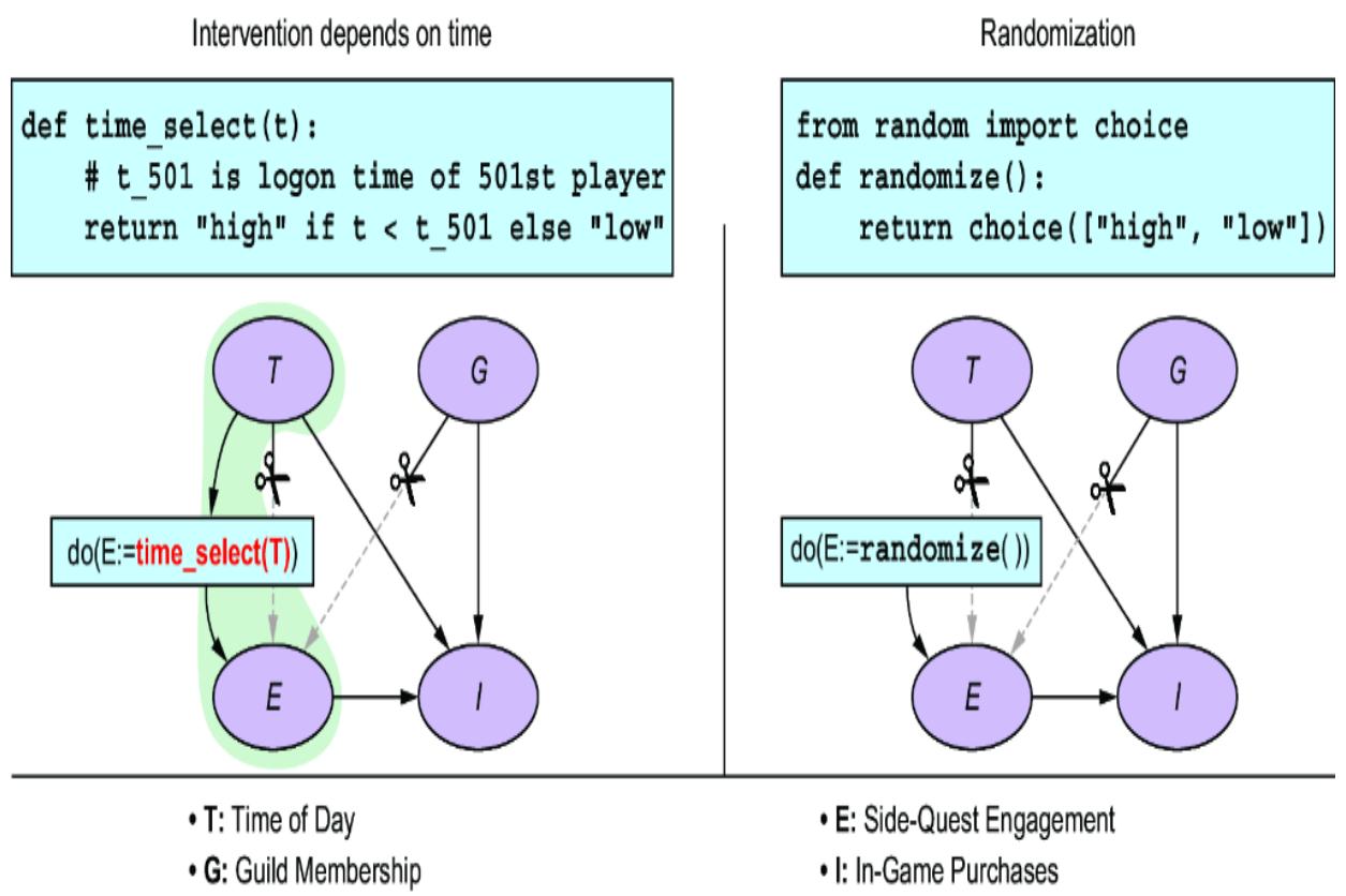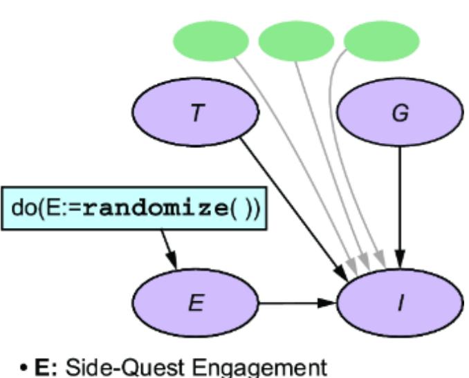 For this new variable A, let A = 1 refer to the treatment group and A=0 refer to the control group. We have this new variable A, and the average treatment effect of the policy on in-game purchases E(IA=1 – IA=0) is an interesting query. But suppose we’re still ultimately interested in knowing the average treatment effect of side-quest engagement itself on purchases, i.e., E(IE=૿high – IE=૿low).