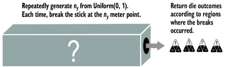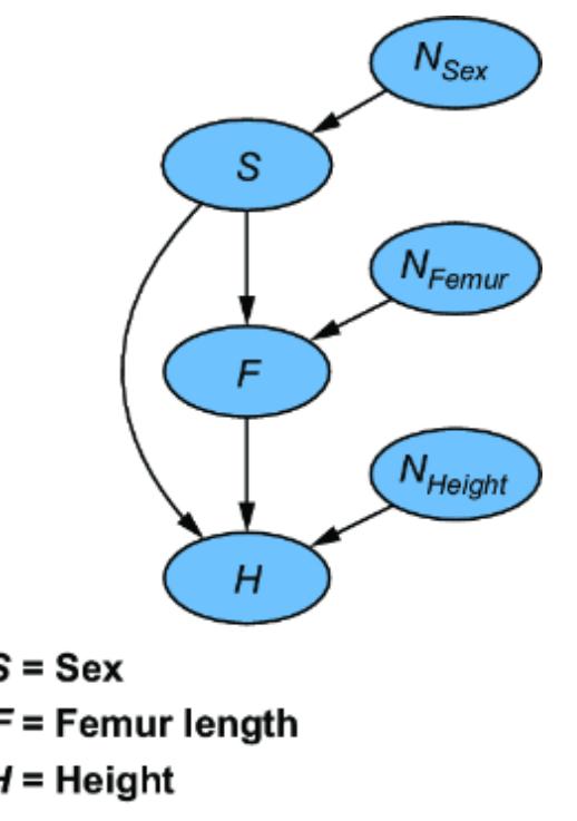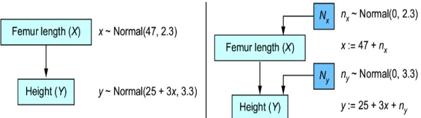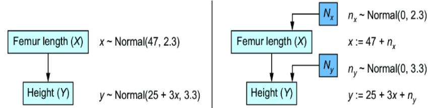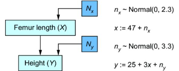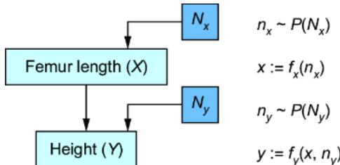 Here, x is femur length in centimeters, and y is height in centimeters. Of course, exact height will vary with other causal factors, and ny represents variations in height from those factors. Ny has a normal distribution with mean 0 and scale parameter 3.3 cm.