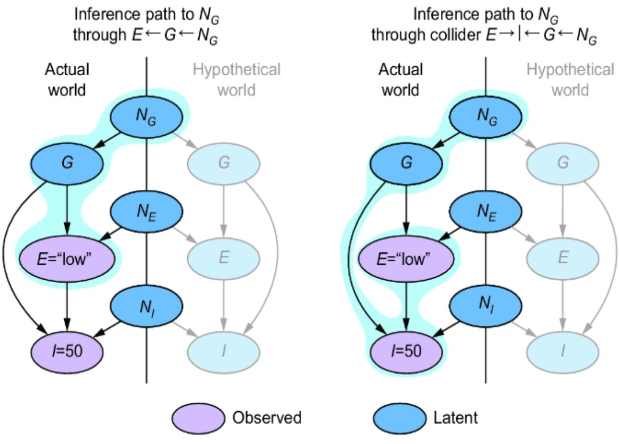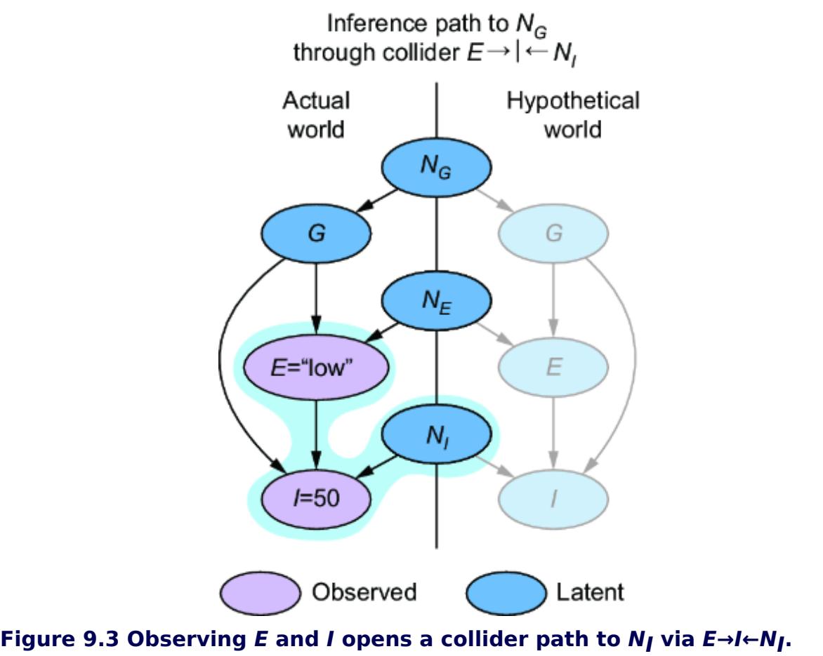 But for this we’d need N IID samples from an observational distribution where we had graphical identification (P(G, E, W, I), P(G, E, I), or P(E, W, I)). In the case of P(G, E, W, I), where all the variables in the DAG are observed, the number of unknown variables is just the number of parameters. But in the latter two cases, of P(G, E, I) or P(E, W, I), where there is a latent G or W of size N, the number of unknowns grows with N. In this case, SVI will scale better with large N. We’ll see an example in chapter 11.