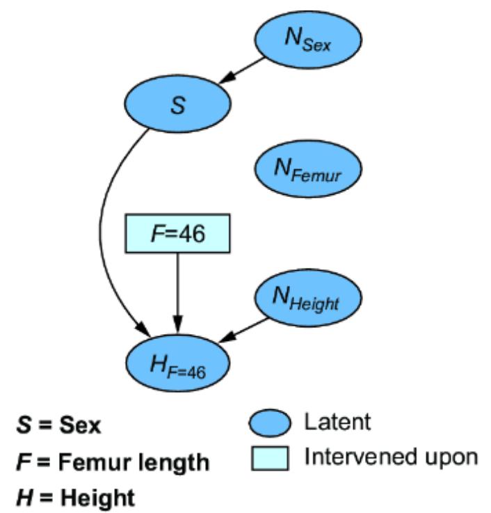 This is an example of an SCM. We’ll expand this example as we go, but the key element to focus on here is that our model is assuming the causal mechanism underpinning height (Y ) is linear. Height (Y ) is a linear function of its causes, femur length (X ) and Ny, which represents other causal determinants of height.