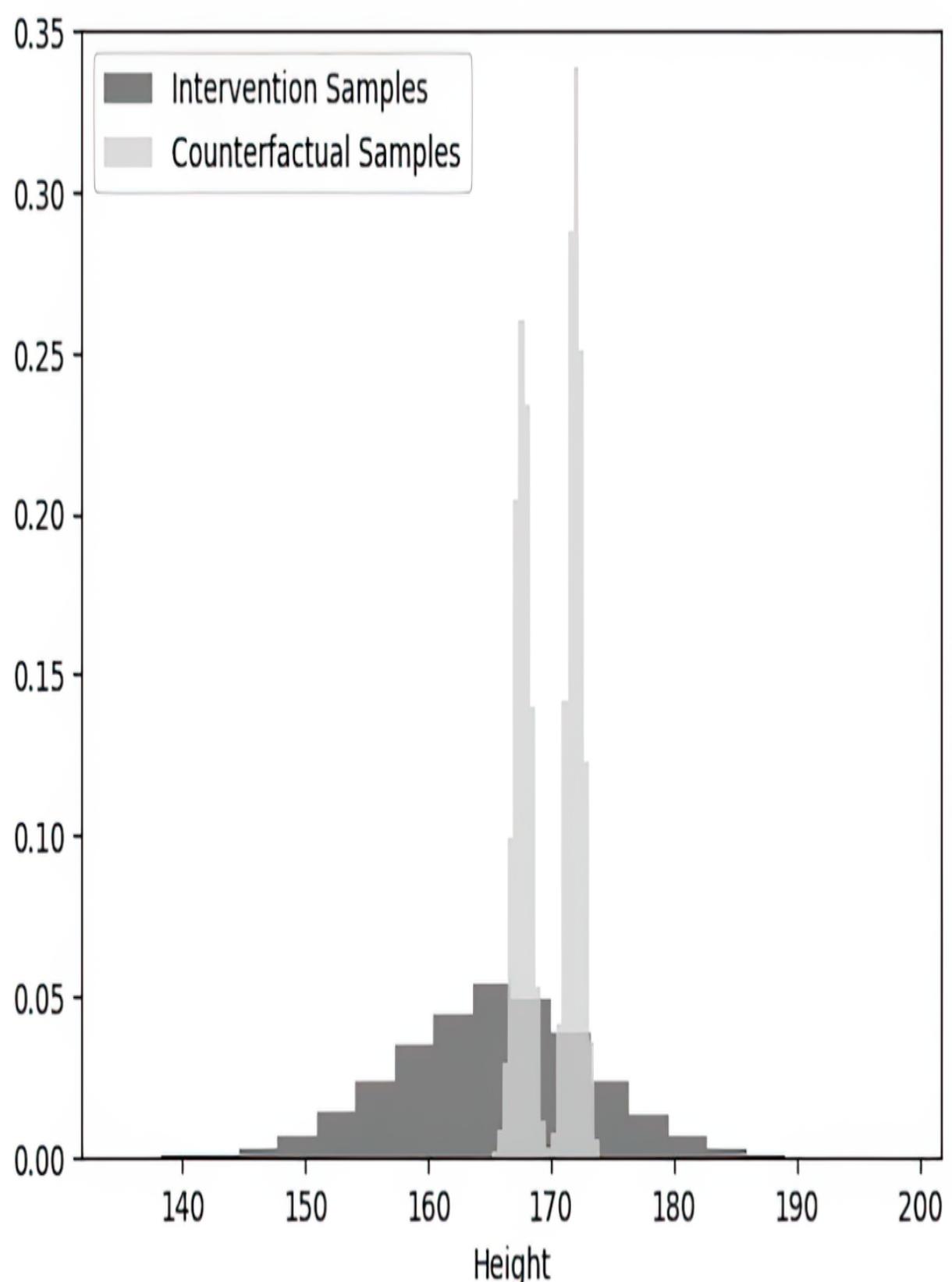 We’ll contrast these samples from P (IE=0) with samples we’ll draw from P (IE=0|E = 1). To infer P (IE=0 |E = 1), we’ll condition intervention_model on the factual condition E = 1. Then we’ll run inference again on this conditioned-upon intervened-upon model.