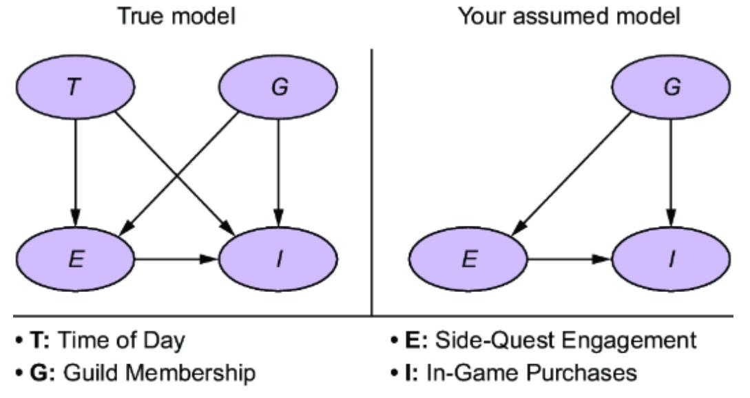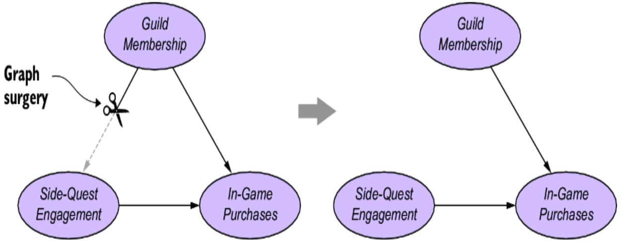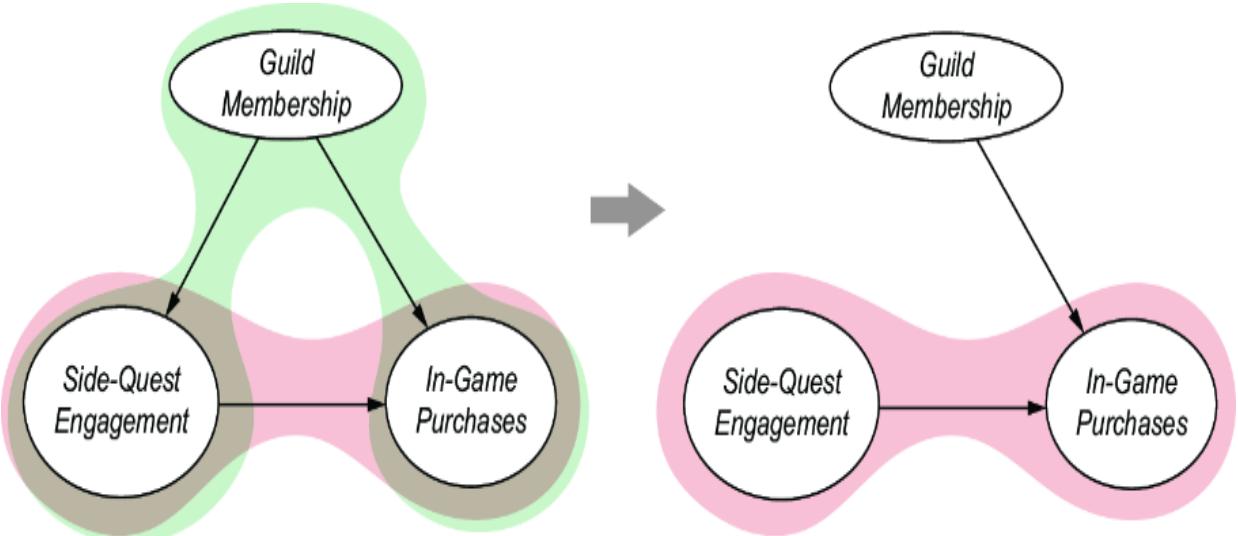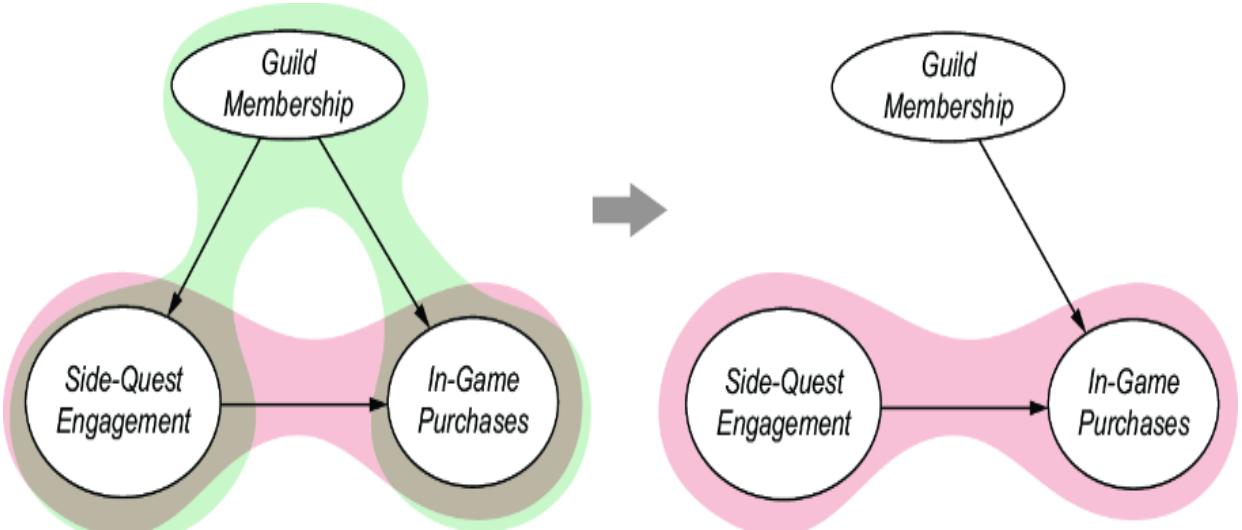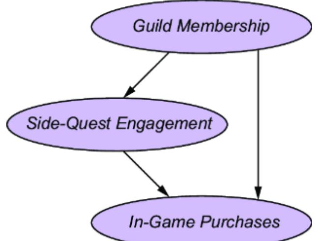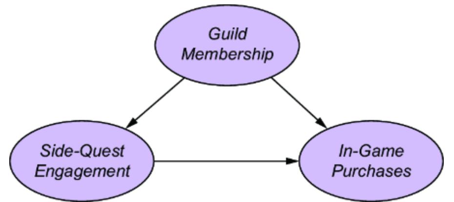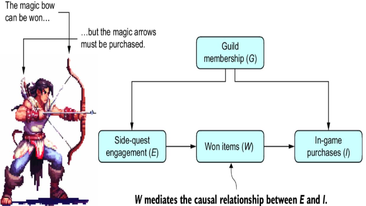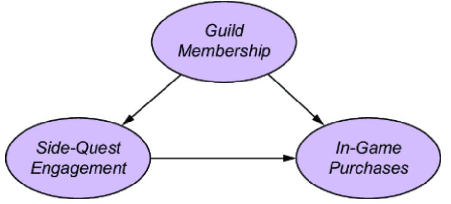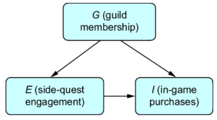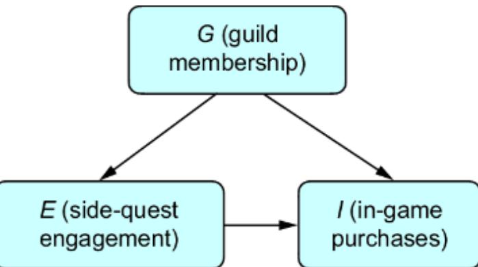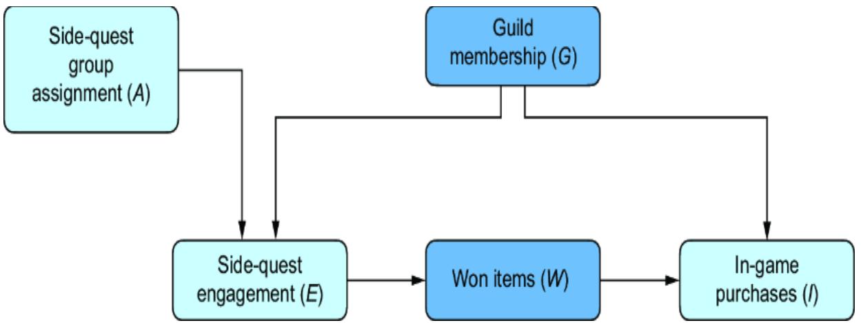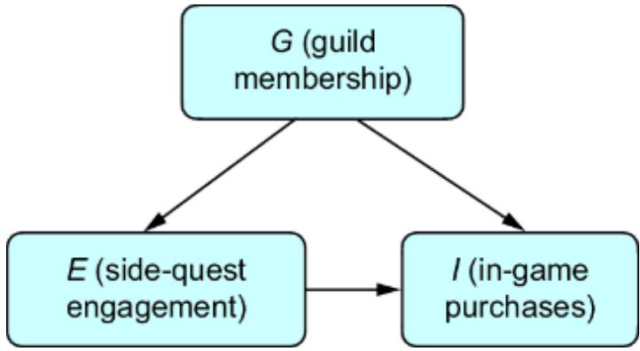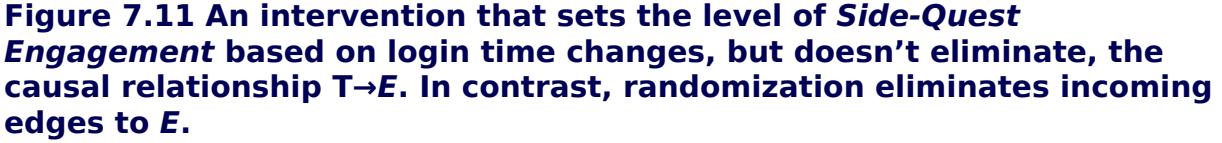 Suppose in our online gaming example you ran an experiment where you randomly assigned players to a treatment or control group. Players in the treatment group are exposed to a policy that encourages more side-quest engagement. You reason that since you can’t actually force players to engage in side-quests, it’s better to have this randomized treatment/control variable as a parent of our side-quest engagement variable, as seen in the DAG in figure 10.25.