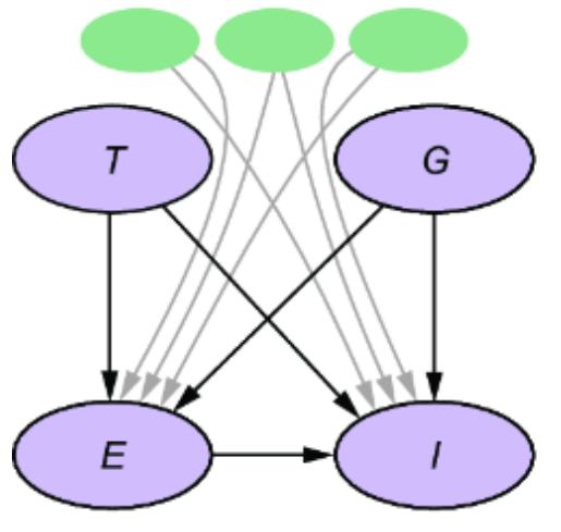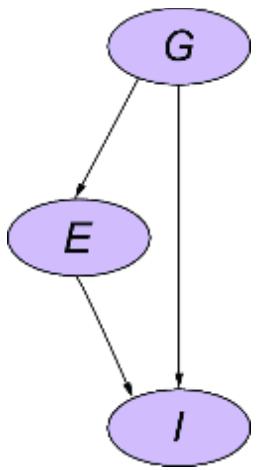 Figure 10.25 We don’t have identification for the ATE of E on I because G and W are unobserved. But we have partial identification given variable A, representing gamers’ assignments in a randomized experiment.