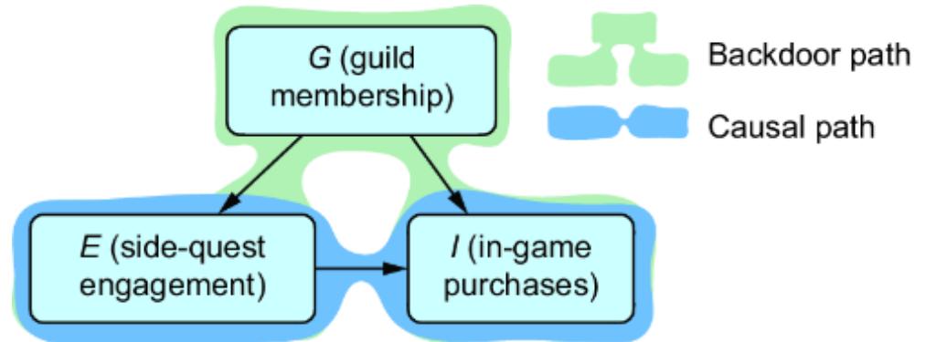If guild membership (G ) were observed, we’d have identification through backdoor adjustment. If won items (W ) were observed, we could use front-door adjustment. But suppose that in this scenario you observe neither. In this case, observing the side-quest group assignment variable would give you partial identification. Suppose that the ingame purchases variable was a binary 1 for ૿high and 0 for ૿low instead of a continuous value. Then the bounds on E(IE=૿high – IE=૿low) are