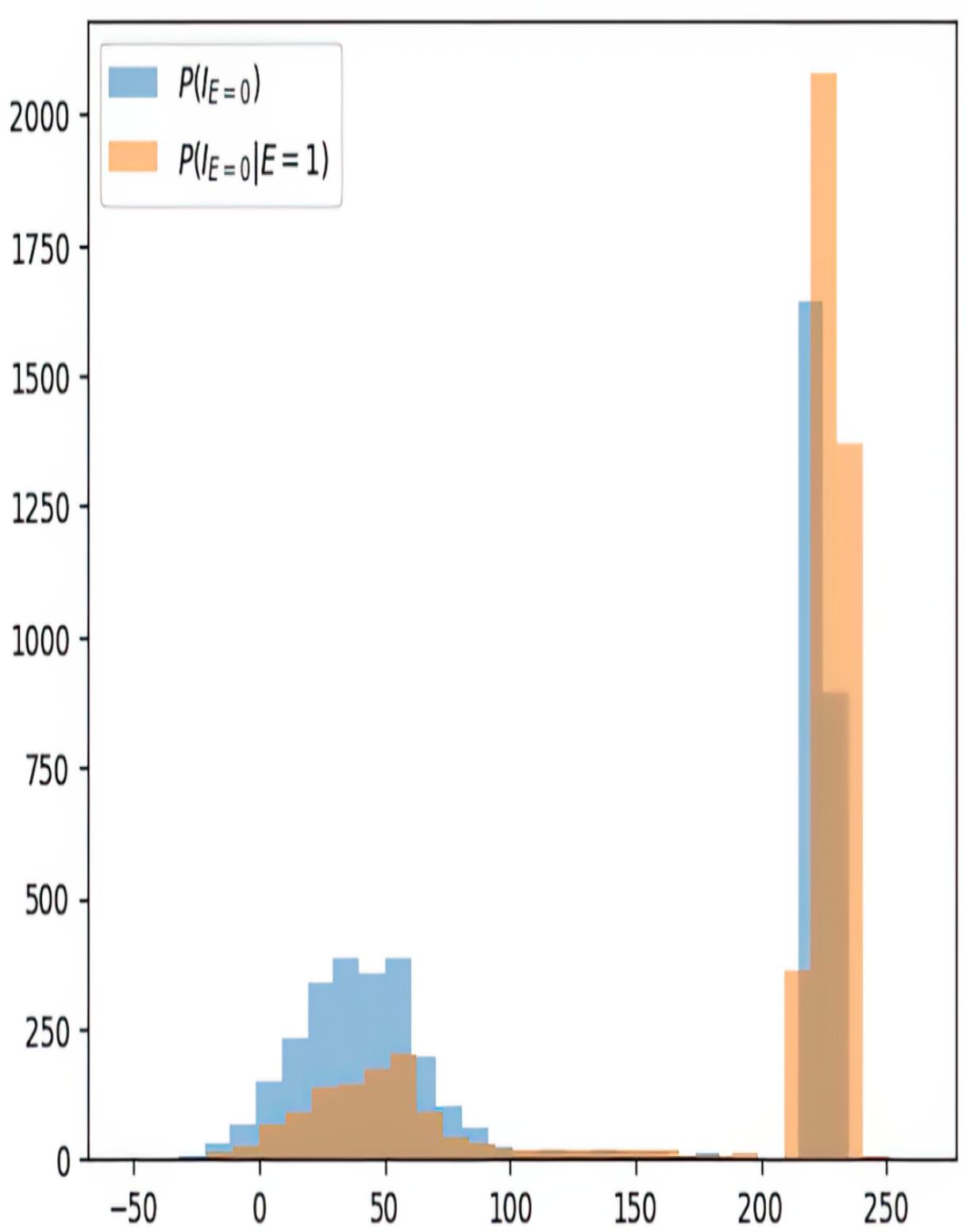 Finally, we’ll plot samples from P (IE=0) and P (IE=0|E = 1) and evaluate the difference in these distributions.