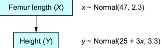 Figure 6.1 A simple two-node CGM. Femur length (X) is a cause of height (Y). X has a normal distribution with a mean of 47 centimeters and a standard deviation of 2.3 centimeters. Y has a distribution with a mean of 25 + 3x centimeters and a standard deviation of 3.3 centimeters.
