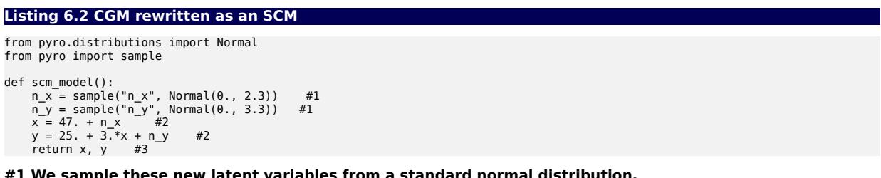 Most SCMs you’ll encounter in papers and textbooks are written down as math. However, this rock-throwing example shows us the power of reasoning causally with an imperative scripting language like Python. Some causal processes are easier to write in code than in math. It is only recently that tools such as Pyro have allowed us to make sophisticated code-based SCMs.
