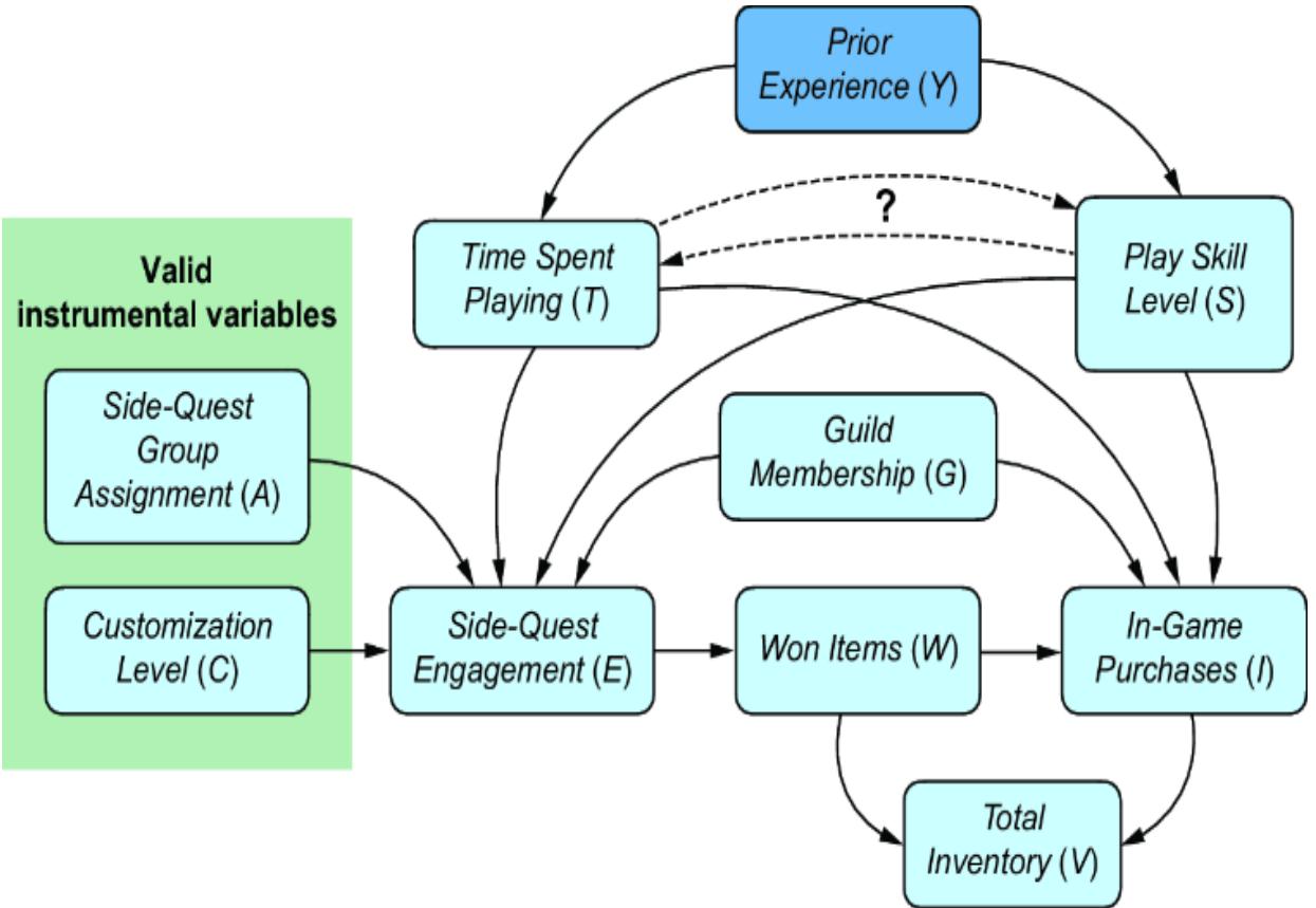 Figure 11.2 An expanded version of the online gaming DAG. With respect to the causal effect of side-quest engagement on in-game purchases, we add two additional confounders and two instruments.