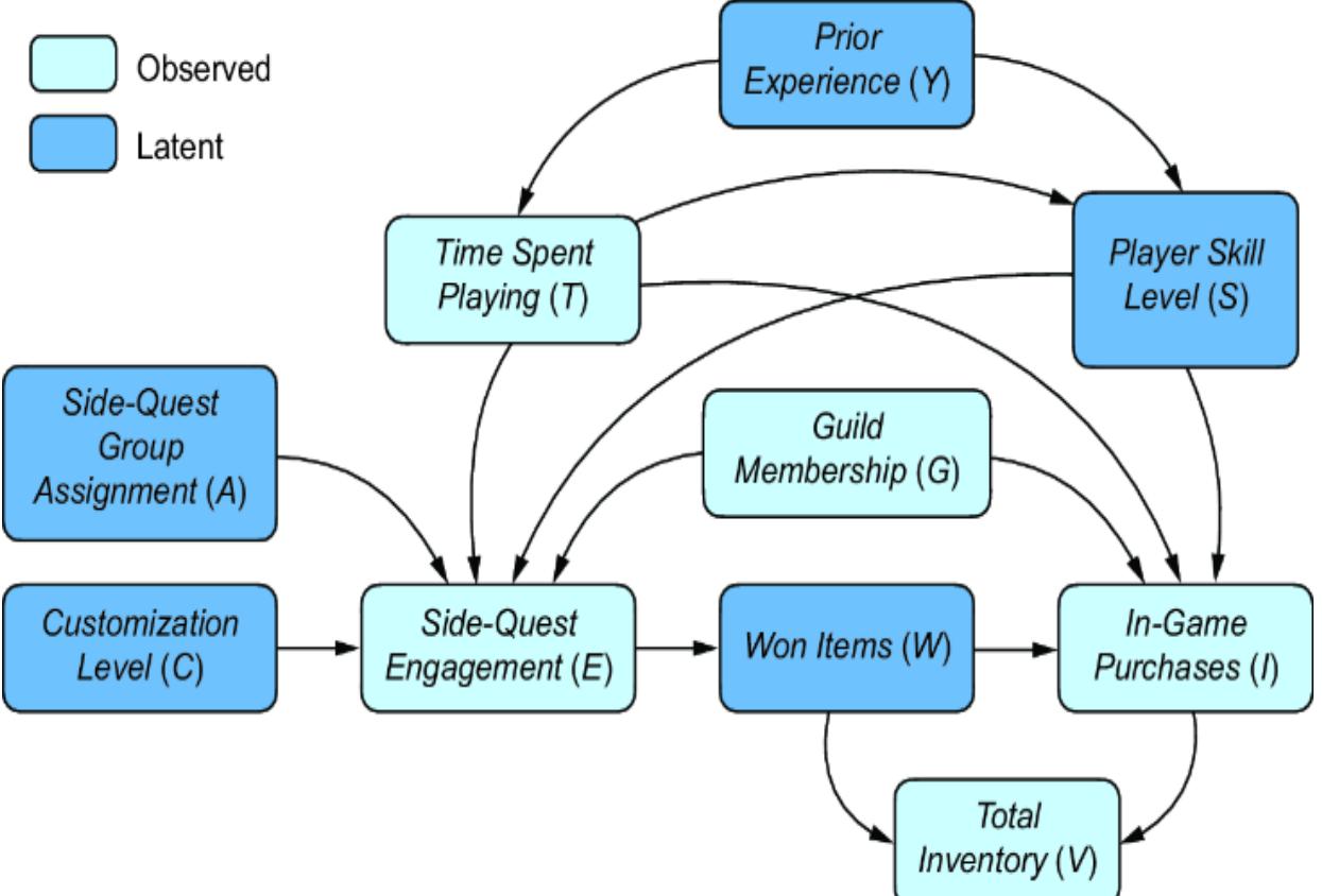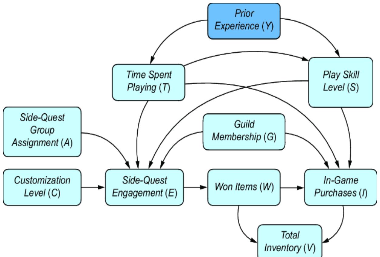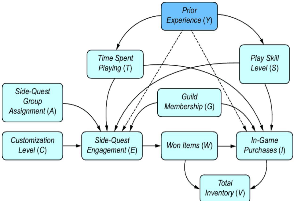Further, as we investigate our gaming data, we find data from a past experiment designed to test the effect of encouraging side-quest engagement on in-game purchases. In this experiment, all players were randomly assigned either to the treatment group or a control group. In the treatment group, the game mechanics were modified to tempt players into engaging in more side-quests, while the control group played the unmodified version of the game. We’ll define the Side-Quest Group Assignment (A) variable as whether the player was assigned to the treatment group in this experiment or the control group.