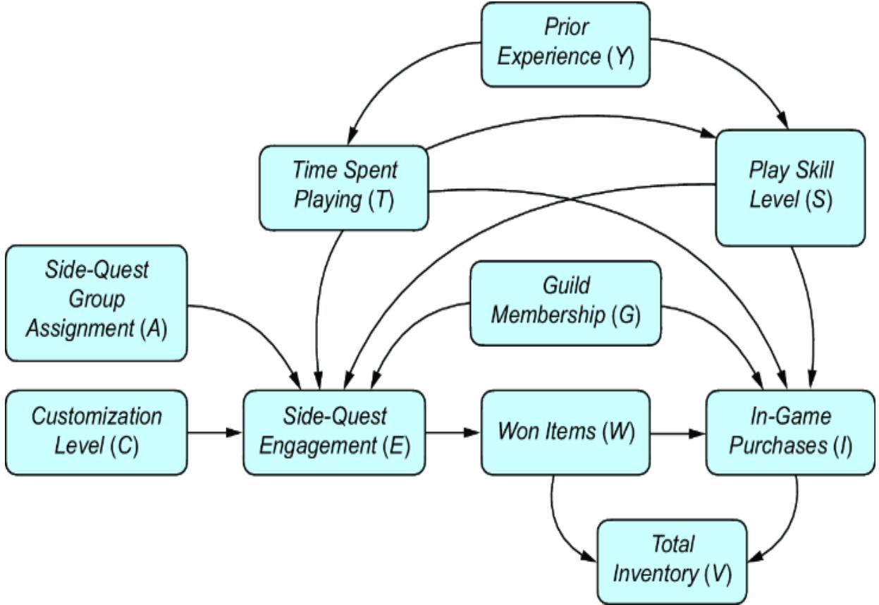 Next, we’ll build our causal model. Since we are targeting an ATE, we can stick with a DAG. Let’s suppose we build a more detailed version of our online gaming example and produce the causal DAG in figure 11.2.