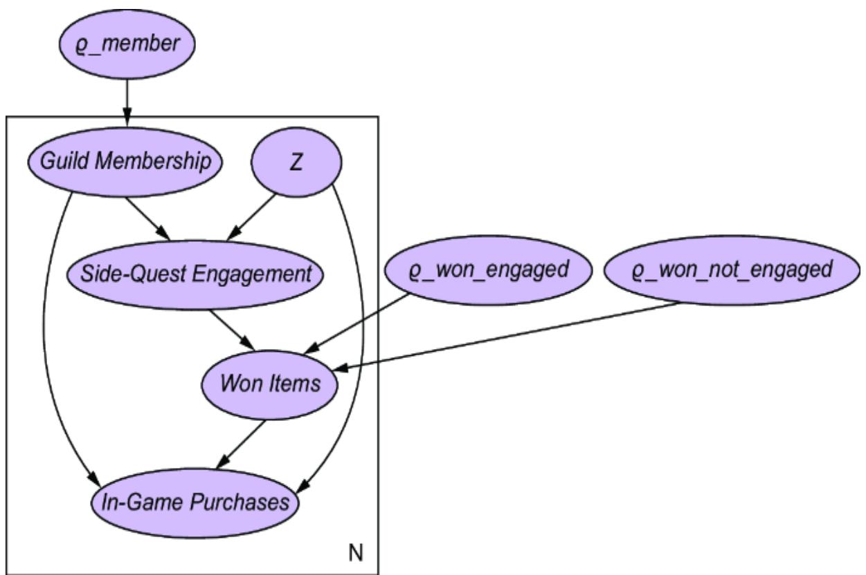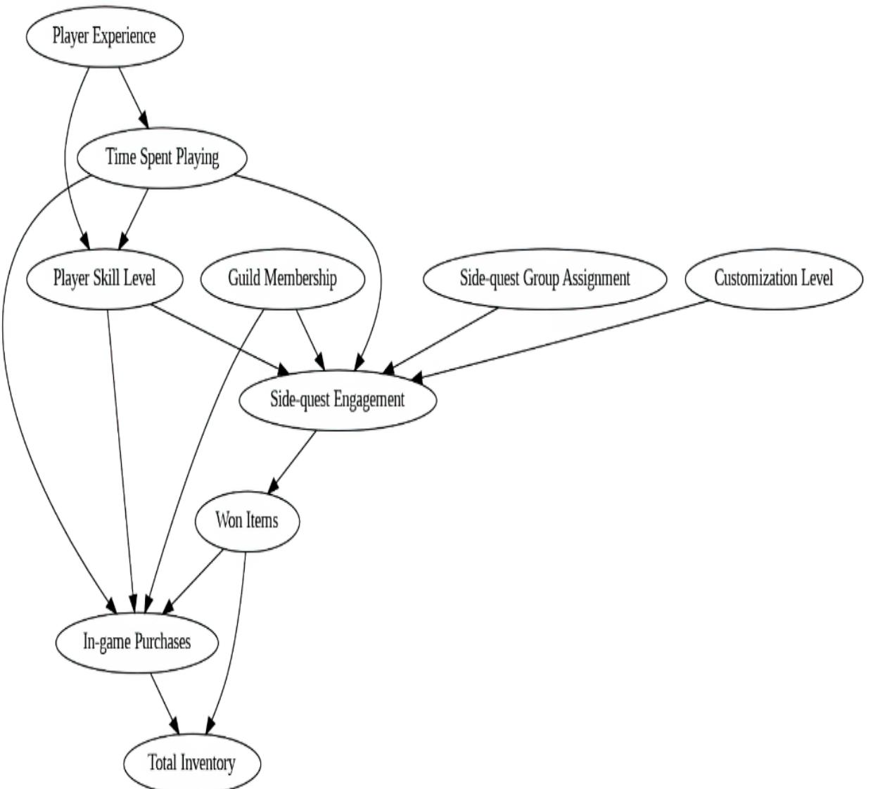 Finally, we’ll add Total Inventory. This is a collider between In-Game Purchases and Won Items. Perhaps it is common for data scientists in our company to use this as a predictor of the In-Game Purchases. But as you’ll see, we’ll want to avoid adding collider bias to causal effect estimation.