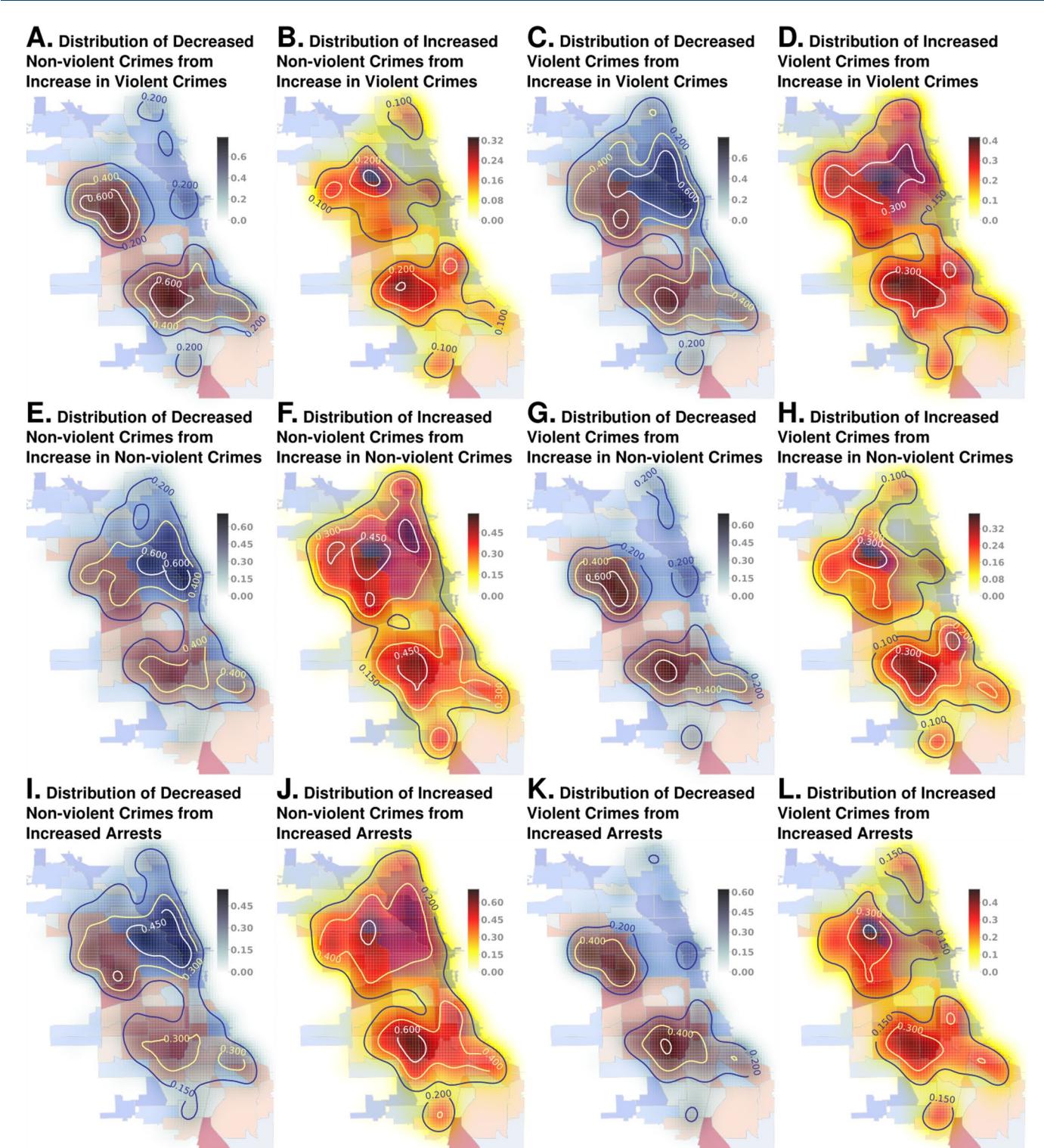 Extended Data Fig. 3 | Perturbation Effects Across Variables. We see that the decrease of violent crimes from increase of property crimes are localized in disadvantaged neighborhoods (panel g). Similarly, the decrease of property crimes from increase of violent crimes is also localized to disadvantaged neighborhoods (panel a), as well as the decreased violent crimes from increased arrests (panel k). We see a weaker localization for the corresponding increases in crime rates under similar perturbations. Looking at other pairs of variables under perturbation (rest of the panels), we generally do not see a very prominent correspondence with the distribution of socio-economic indicators. It seems crimes (and particularly violent crimes) are easier to dampen in locales with high existing crime rates, which is desirable result. But such conclusions are currently confounded by SES variables, and further work is needed to investigate these effects more thoroughly.