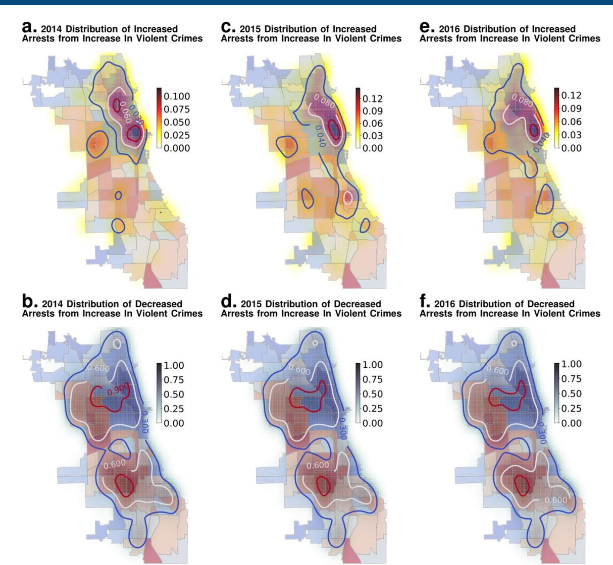 The results of our perturbation experiments both shed light on the stability characteristics of crime in Chicago and further allowed us to look for evidence of biased police enforcement responses under stress. Under stress, well-off neighbourhoods tend to drain resources disproportionately from disadvantaged locales (Fig. 3). Economically well-off neighbourhoods in the bottom 25% of the hardship index are much more likely to see a near-proportional increase (~15%) in law enforcement response, measured by the number of predicted arrests on a 10% increase in crime rates (Fig. 3c,d, which shows how regions with increased enforcement response are concentrated in well-off neighbourhoods), while the rest of the city sees a drop in the predicted response of about twice the magnitude (>30%). Increased crimes causes enforcement resources to be drained from disadvantaged neighbourhoods to support their counterparts with better SES. We performed multivariable linear regression analysis to evaluate this question in another way. Here, we regressed the violent and property crime rates, independently, on the variables listed in Fig 3b, including a slope intercept variable in each model. In both models, the hardship index’s strong, negative coefficient for changes in the arrest rate from perturbations that increase the violent and property crime rates contradicts what might be expected in the absence of bias. Lower-SES neighbourhoods have more crime, and so these socio-economic indicators should contribute positively to the arrest rate with increasing crime. These patterns were replicated in our perturbation experiments for all the preceding years we analysed (2014-2017; Extended Data Figs. 4 and 5). The response measured in the property and violent crimes, and associated arrests, from perturbations is detailed in Extended Data Fig. 3.