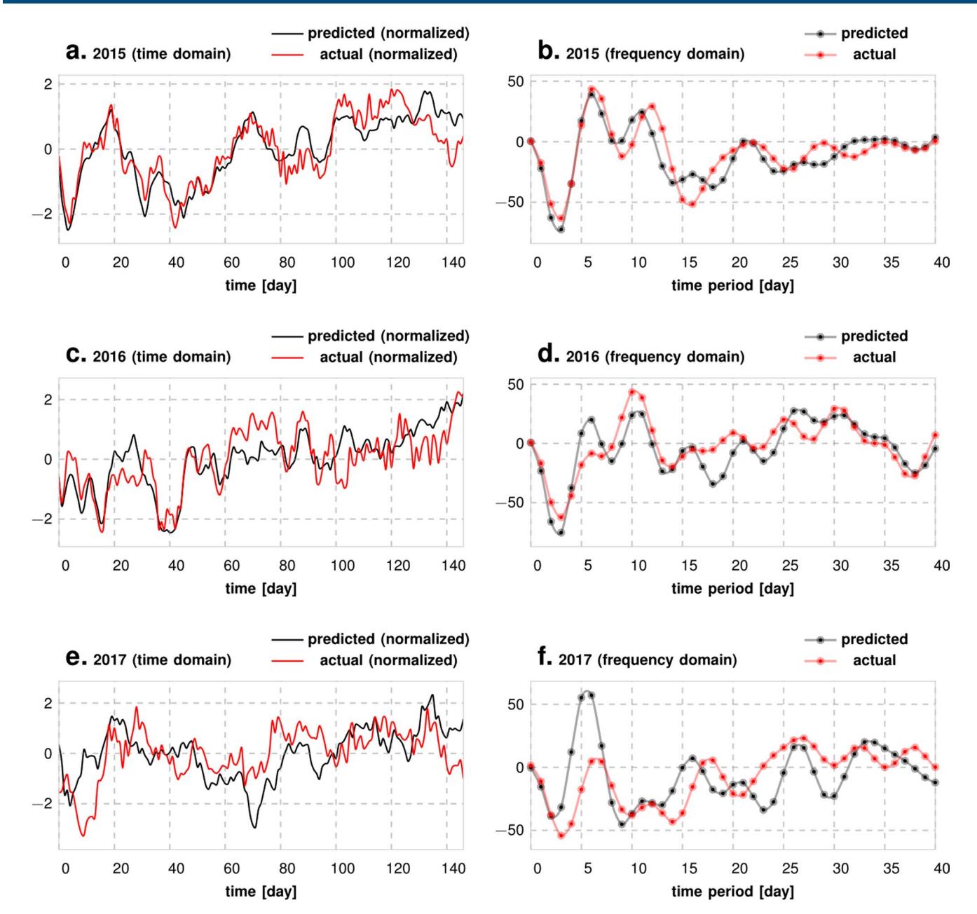 Extended Data Fig. 2 | Comparison of Predicted vs Actual Sample Paths in Time and Frequency Domains. Panels a, c and e show that the predicted and actual sample paths are pretty close for different years, when compared over the first 150 days of each year. Panels b, d and f show that the Fourier coefficients match up pretty well as well. More importantly, while our models do not explicitly incorporate any periodic elements that are being tuned, we still manage to capture the weekly, (approximately) biweekly and longer periodic regularities.