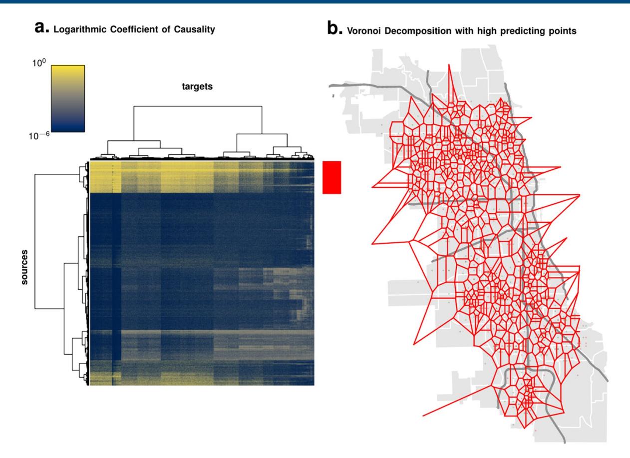 Spatial neighbourhoods. The degree of directed predictive dependency between one variable (the source stream) on another (the target stream), also called the (Granger-)causal influence, is quantified by the coefficient of dependence ( \(\gamma\) ; Supplementary Methods). Identifying the source–target pairs for which the coefficient of dependency (or Granger causality) is high (Extended Data Fig. 6), we note that there exists a sparse set of spatial tiles that exert nearly all of the directed dependency in the entire set of observed variables. Thus, observing these variables alone would enable us to make good event forecasts. These tiles span the expanse of the city, and a Voronoi decomposition based on the centres of these tiles in shown in Extended Data Fig. 6b. Such a decomposition demonstrates an algorithmic approach to choosing optimal neighbourhoods for urban analysis.