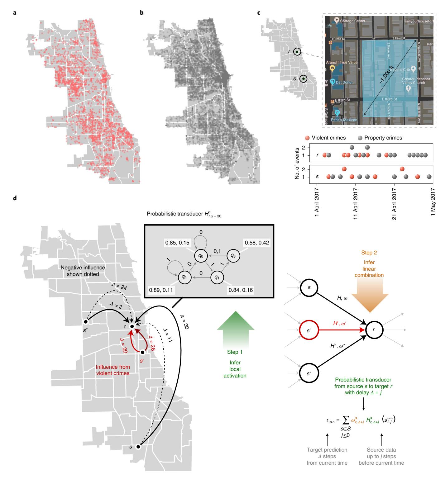 Fig. 1 | Crime data and modelling approach. a,b, Violent crimes (a) and property crimes (b) recorded within the 2 week period between 1 and 15 April 2017. c, Our modelling approach. We break a city into small spatial tiles approximately 1.5 times the size of an average city block and compute models that capture multi-scale dependencies between the sequential event streams recorded at distinct tiles. We treat violent and property crimes separately, and show that these categories have intriguing cross dependencies. d, An illustration of our modelling approach. For example, to predict property crimes at some spatial tile r, we proceed as follows: Step 1: we infer the probabilistic transducers that estimate the event sequence at r by using as input the sequences of recorded infractions (of different categories) at potentially all remote locations (s, s’ and s’’ are shown), where this predictive influence might transpire over different time delays (a few are shown on the edges between s and r). Step 2: we combine these weak estimators linearly to minimize zero-one loss. The inferred transducers can be thought of as inferred local activation rules that are then linearly composed, reversing the approach of linearly combining the input and then passing through fixed activation functions in standard neural net architectures. The connected network of nodes (variables) with probabilistic transducers on the edges forms the Granger network.