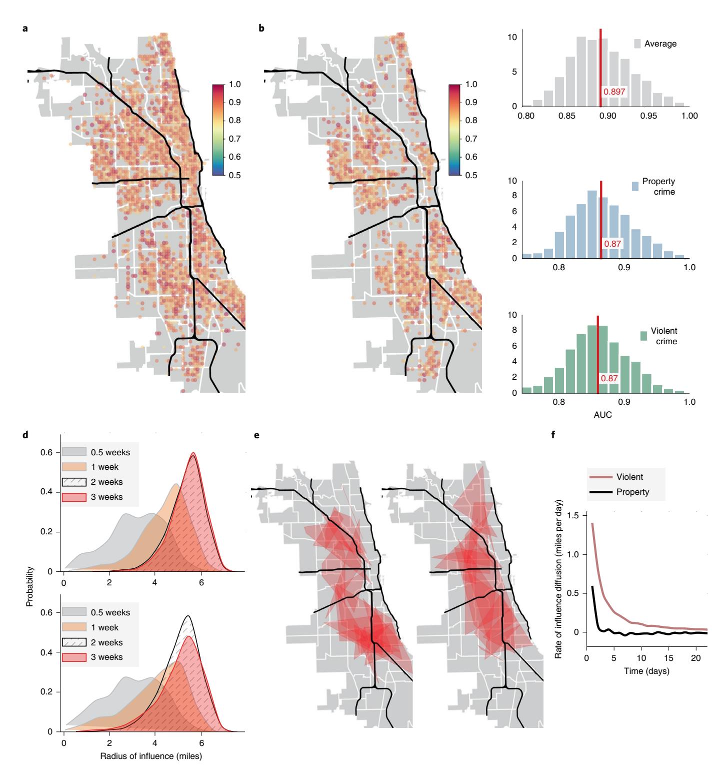 Fig. 2 | Predictive performance of Granger networks. a,b, Out-of-sample AUC for predicting violent (a) and property crimes (b). The prediction is made 1 week in advance, and the event is registered as a successful prediction if we get a hit within ±1 day of the predicted date. c, Distribution of AUC on average, individually for violent and property crimes. Our mean AUC is close to 90%. d–f, Influence diffusion and perturbation space. If we are able to infer a model that predicts event dynamics at a specific spatial tile (the target) using observations from a source tile Δ days in future, we say that the source tile is within the influencing neighbourhood for the target location with a delay of Δ. Spatial radius of influence for 0.5, 1, 2 and 3 weeks (d), for violent (upper panel) and property crimes (lower panel). Note that the influencing neighbourhoods, as defined by our model, are large and approach a radius of 6 miles. Given the geometry of the City of Chicago, this maps to a substantial percentage of the total area of the urban space under consideration, demonstrating that crime manifests demonstrable long-range and almost city-wide influences. Extent of a few inferred neighbourhoods at a time delay of at most 3 days (e). Average rate of influence diffusion measured by number of predictive models inferred that transduce influence as we consider longer and longer time delays (f). Note that the rate of influence diffusion falls rapidly for property crimes, dropping to zero in about 1 week, whereas for violent crimes, the influence continues to diffuse even after 3 weeks.
