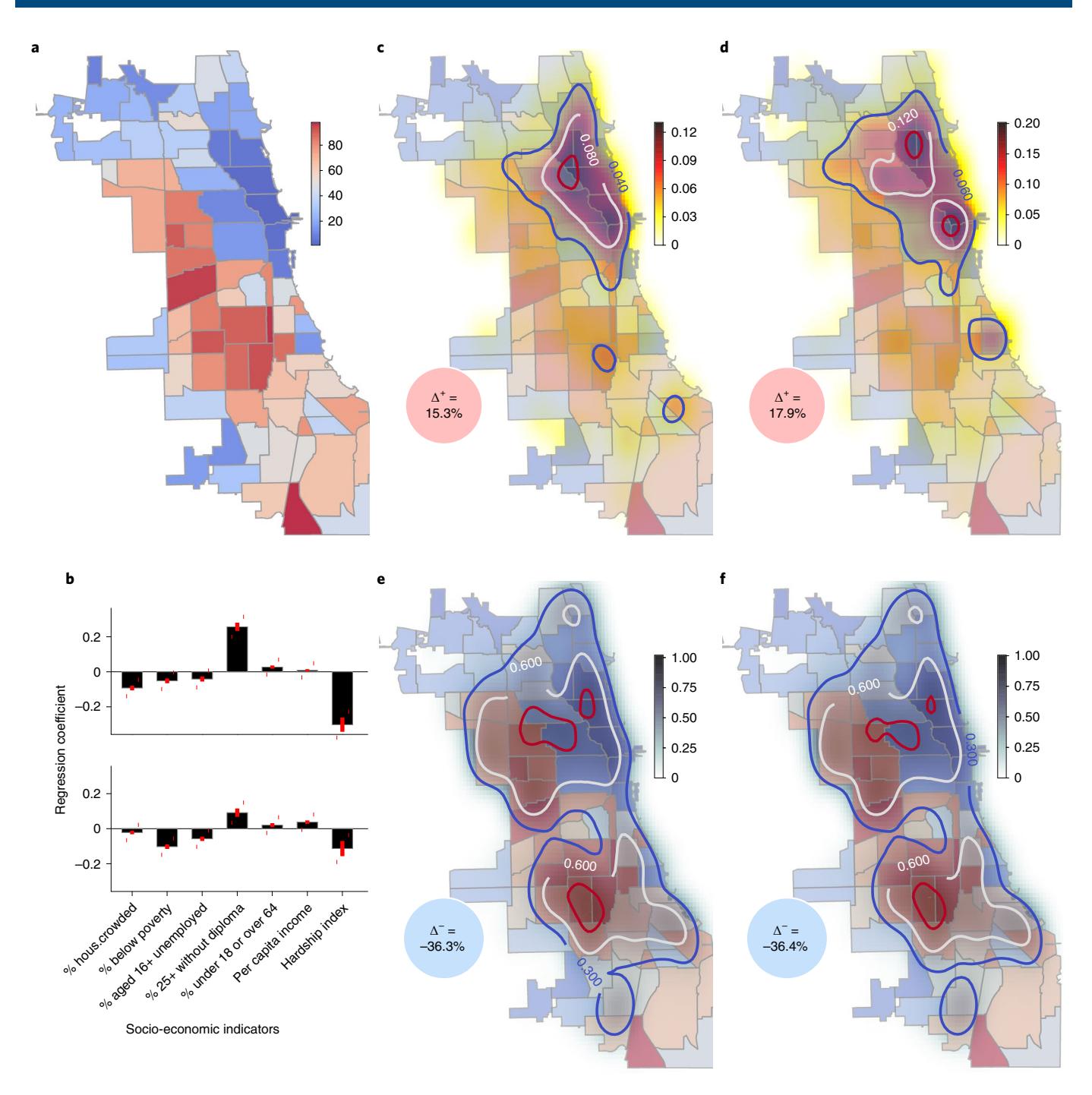 Fig. 3 | Estimating bias. a, Distribution of the economic hardship index53. b, Perturbation in violent (upper) and property (lower) crime rate via multivariable regression, where the hardship index is seen to make a strong negative contribution. Error bars show 95% confidence interval. c-f, Biased response to perturbations in crime rates: \(\Delta^+\) = 15.3% (c), \(\Delta^+\) = 17.9% (d), \(\Delta^-\) = -36.3% (e) and \(\Delta^-\) = -36.4% (f). With a 10% increase in violent or property crime rates, we see an approximately 30% decrease in arrests when averaged over the city. The spatial distribution of locations that experience a positive versus negative change in arrest rate reveals a strong preference favouring high-SES locations. If neighbourhoods are doing better socio-economically, increased crime predicts increased arrests. A strong converse trend is observed in predictions for lower-SES, poor and disadvantaged neighbourhoods, suggesting that, under stress, wealthier neighbourhoods drain resources from their disadvantaged counterparts.