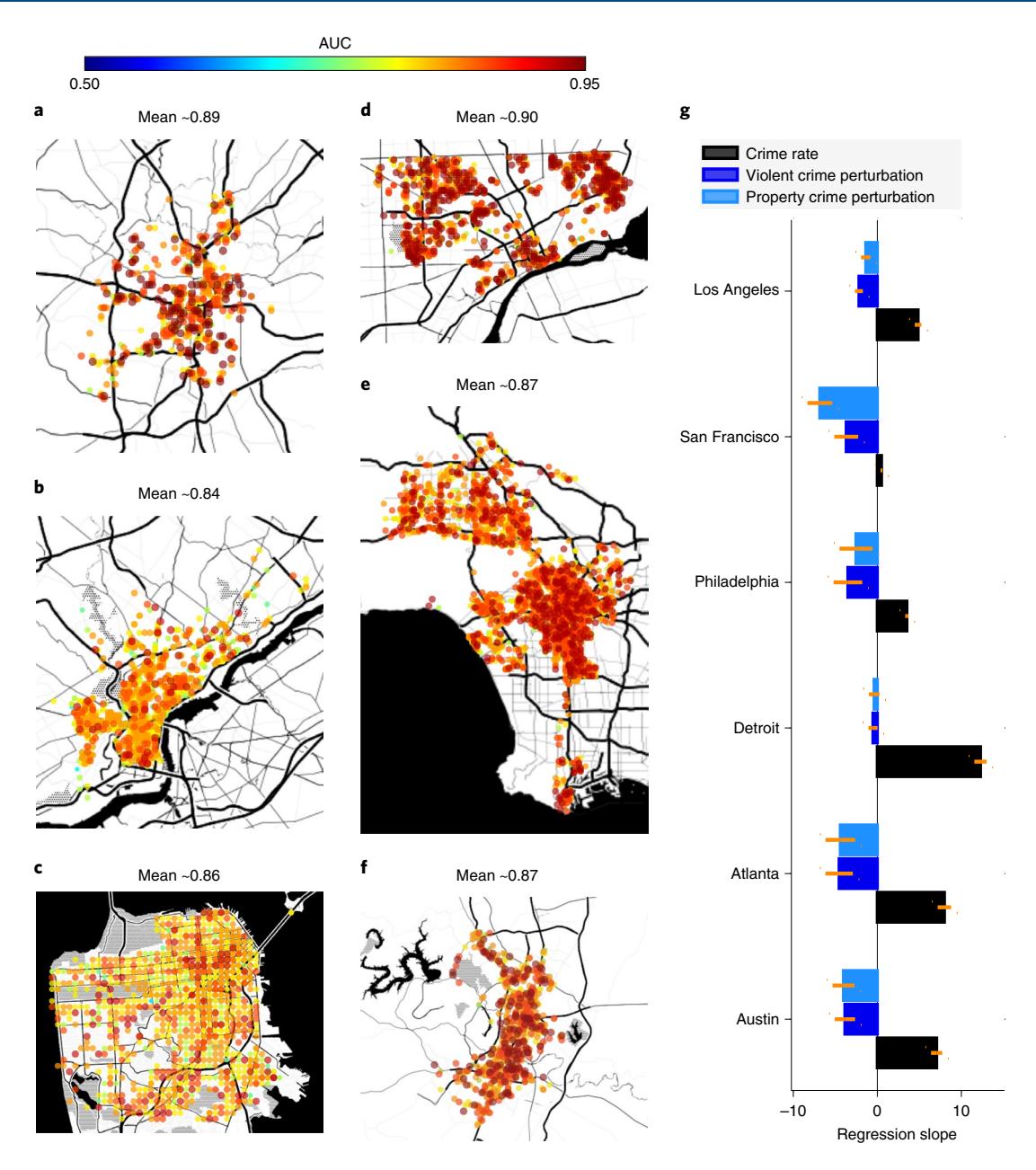 Fig. 4 | Prediction of property and violent crimes across major US cities and the dependency of the perturbation response on the SES of local neighbourhoods. a–f, AUCs obtained in six major US cities: Atlanta (a), Philadelphia (b), San Francisco (c), Detroit (d), Los Angeles (e) and Austin (f), chosen on the basis of the availability of detailed event logs in the public domain. All of these cities show comparably high predictive performance. g, Regression against poverty (standard error bars). Results obtained by regressing crime rate and perturbation response against SES variables (shown here for poverty, as estimated by the 2018 US census). Note that, while the crime rate typically goes up with increasing poverty, the number of events observed 1 week after a positive perturbation of 5–10% increase in crime rate is predicted to fall with increasing poverty. We suggest that this decrease can be explained by disproportionate reallocation of enforcement resources away from disadvantaged neighbourhoods in response to increased event rates, leading to a smaller number of reported crimes.