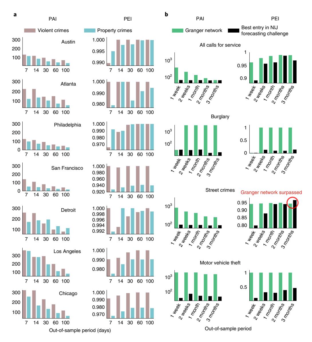 Fig. 5 | The PAI and PEI calculated for seven metropolitan cities. a, The calculated PAI and PEI values. b, A comparison of the PAI and PEI achieved by our approach (Granger network) against the best-performing teams in a crime forecast challenge hosted by the NIJ in 2017 (https://nij.ojp.gov/funding/real-time-crime-forecasting-challenge), where teams attempted to predict hotspots for five different crime categories over different horizons prospectively. Our approach outperforms the teams in all but 1 (highlighted) of 120 categories.