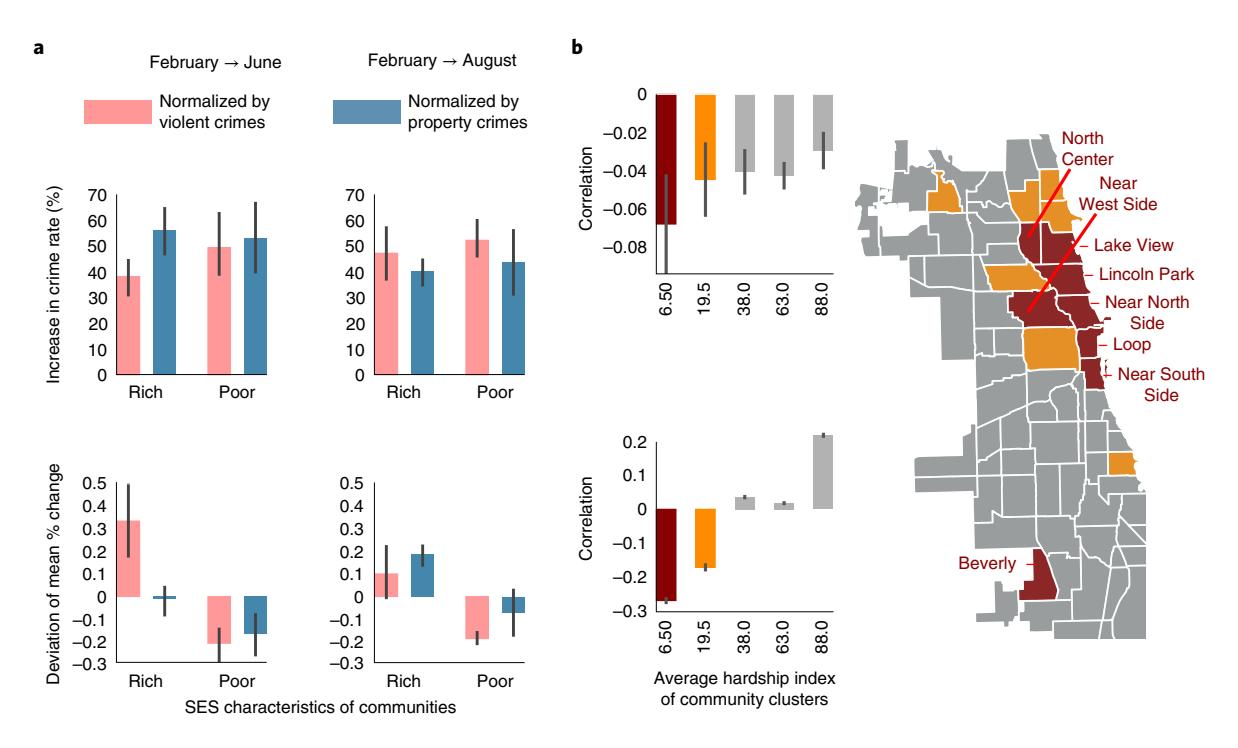 Fig. 6 | Direct observations of the differential response of arrest rate changes with SES variables. a, Upper: increase in violent and property crime rates from February to June or August, averaged over rich (hardship index <20) and poor neighbourhoods (hardship index >20) over 4 years from 2014 to 2017. Error bars show 95% confidence bounds. The average percentage increase in the event rate from late winter to summer is more or less comparable across the city. Lower: the deviation of the mean percentage change in the arrest rate per unit change in crime rate with respect to the city-wide average varies with the average SES of the communities. Wealthier communities see an increase in the arrest rate per unit event, while others experience a draw-down. b, Upper: correlation between the daily change in the number of arrests and their 1 day delayed versions in neighbouring communities with higher hardship indices (μ), versus the hardship index of the communities themselves. Lower: correlation of μ with the average hardship index of neighbouring communities, computed within community groups of similar SES. These results illustrate that, in wealthier communities, the higher the average hardship index of its neighbours, the more negative the μ, whereas this effect vanishes and eventually reverses as communities themselves become poorer. Right: locations of the top two community clusters as per their average hardship indices on a map of Chicago. Note, community colours indicate cluster membership.