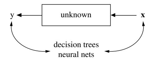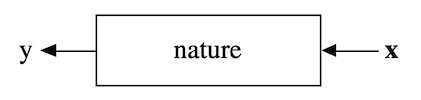 Statistics starts with data. Think of the data as being generated by a black box in which a vector of input variables \(\mathbf{x}\) (independent variables) go in one side, and on the other side the response variables \(\mathbf{y}\) come out. Inside the black box, nature functions to associate the predictor variables with the response variables, so the picture is like this: