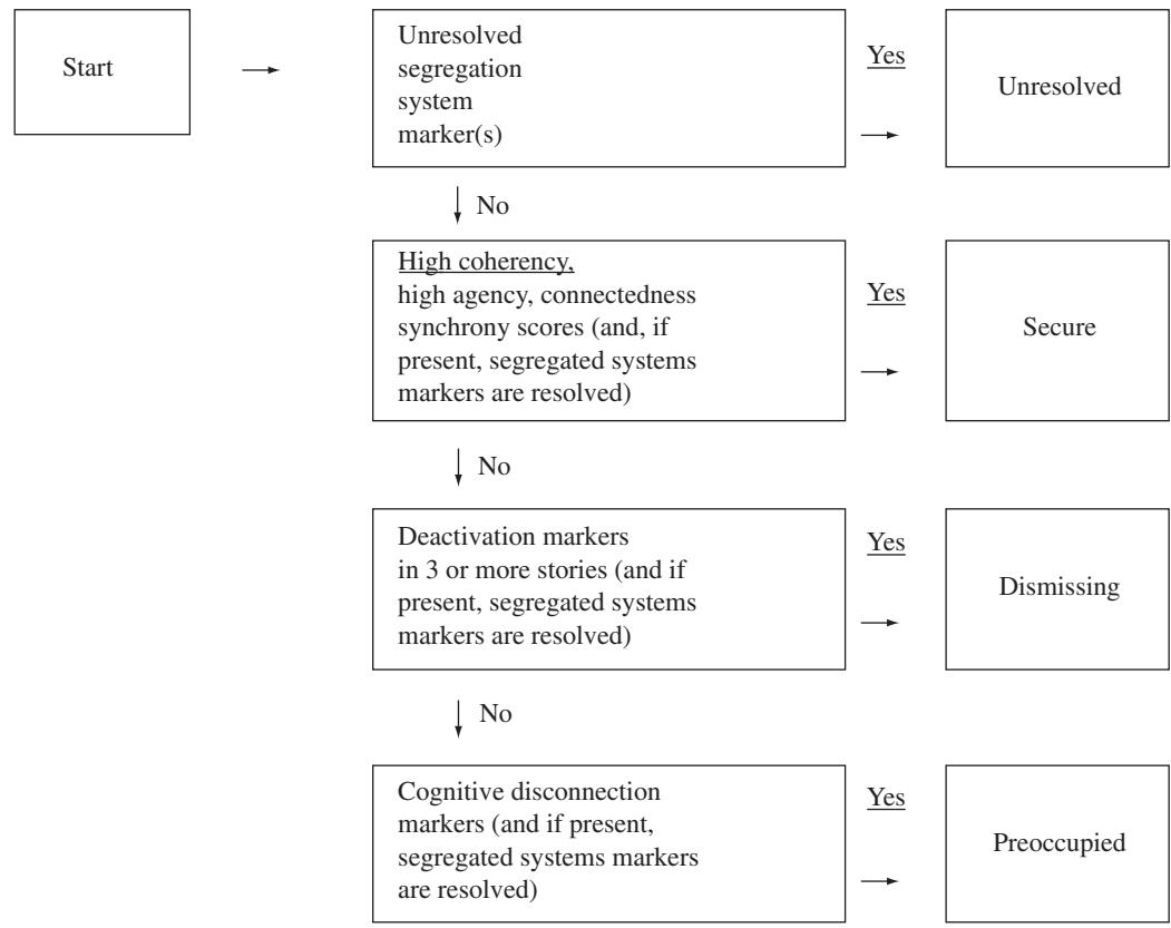 The integration of these features of the AAP to assign an attachment classification can be represented as a hierarchically integrated series of decision points (see Figure 32.4). Classification is assigned on the basis of analysis of the coding patterns for the entire set of seven attachment stories. A judge first notes if there is at least one unresolved segregated systems marker. If an unresolved segregation systems marker is present, the case is assigned the unresolved classification. If all segregated systems markers have been resolved, the judge then examines the pattern of codes used to differentiate secure from insecure cases (coherency, agency of self, connectedness, synchrony). If the case does not fit the secure pattern, the judge then proceeds to examine the specific patterns of defensive exclusion in order to differentiate dismissing and preoccupied attachment. Inspection of each decision