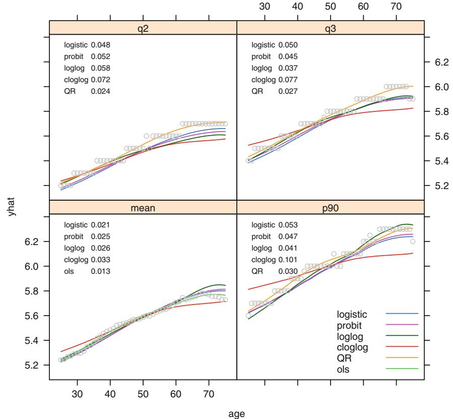ordinal, 311 proportional odds, 73, 311, 312, 313–319, 333, 362, 364 case study, 333–338 logLik, 134, 135 longitudinal data, 143 lowess, see nonparametric lowess, 141, 294 lrm, 65, 131, 134, 135, 201, 269, 269, 273, 277, 278, 296, 297, 302, 306, 319, 323, 335, 337, 339, 341, 342, 448, 513 lrtest, 134, 135 lsp, 133
