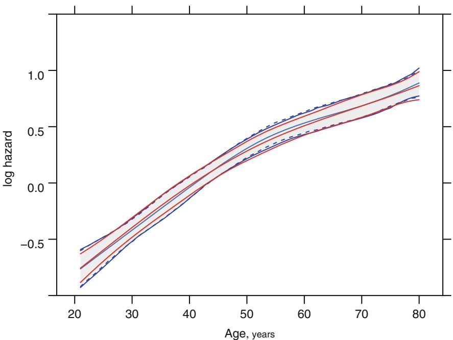 where Rˆ is the estimate of the baseline risk, Prob{Y = 1|X1 = 0}. The risk difference estimate can be plotted against Rˆ or against levels of variables in A to display absolute risk increase against overall risk (Figure 10.2) or against specific subject characteristics. 4