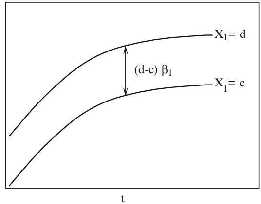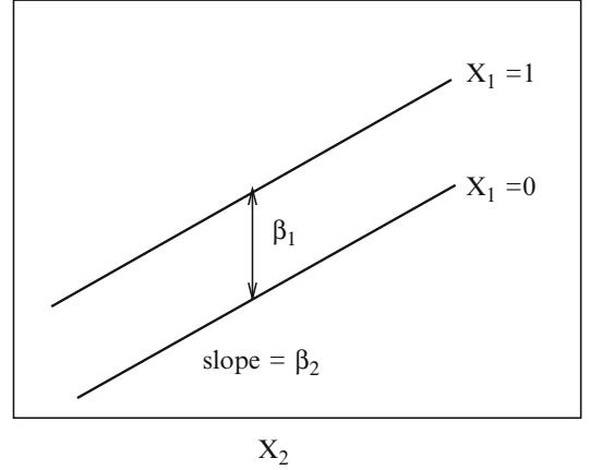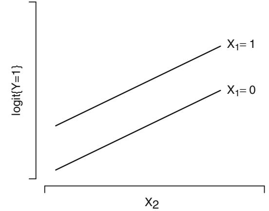 \[\begin{aligned} \text{logit}\{Y=1|X\_1=0, X\_2\} &= \beta\_0 + \beta\_2 X\_2\\ \text{logit}\{Y=1|X\_1=1, X\_2\} &= \beta\_0 + \beta\_1 + \beta\_2 X\_2. \end{aligned} \tag{10.17}\]