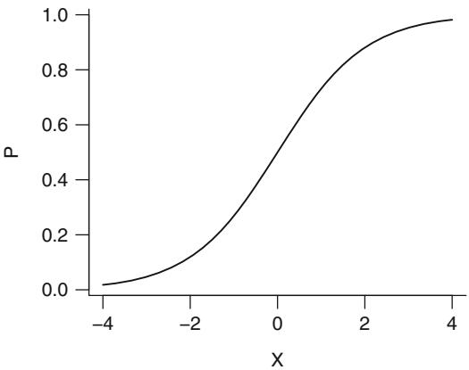 is called the logistic function. This function is plotted in Figure 10.1 for x varying from ×4 to +4. This function has an unlimited range for x while P is restricted to range from 0 to 1.