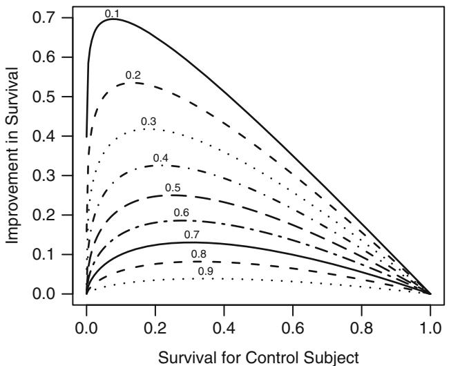 Fig. 10.2 Absolute benefit as a function of risk of the event in a control subject and the relative effect (odds ratio) of the risk factor. The odds ratios are given for each curve.