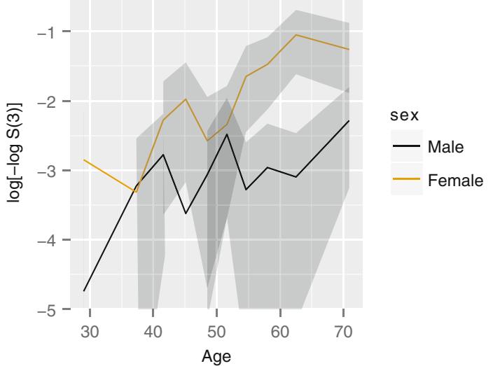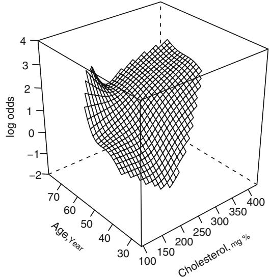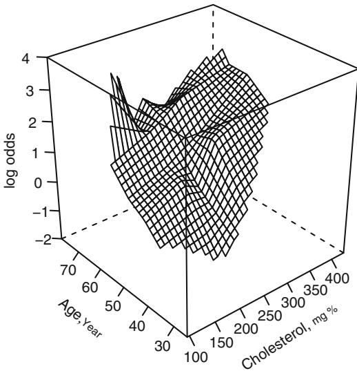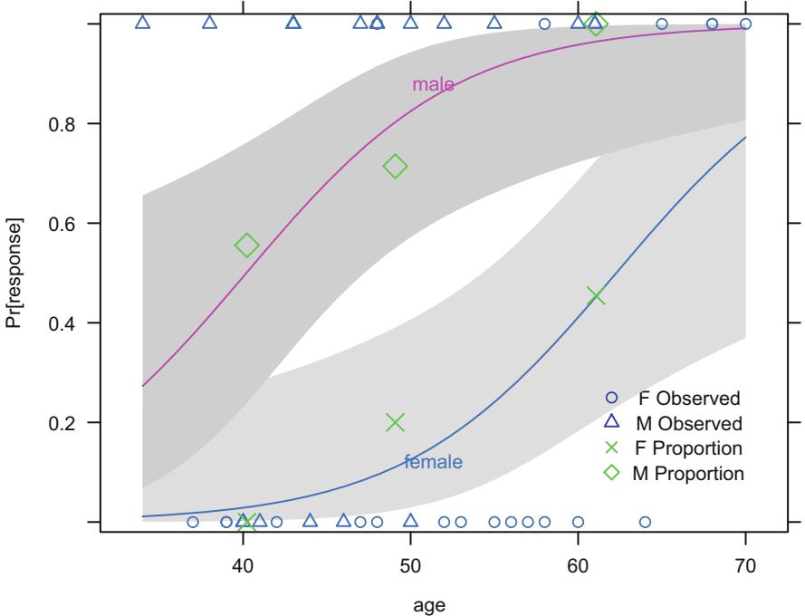 Consider the data in Table 10.2. A graph of the data, along with a fitted logistic model (described later), appears in Figure 10.3. The graph also displays proportions of responses obtained by stratifying the data by sex and age group (< 45, 45 × 54, ← 55). The age points on the abscissa for these groups are the overall mean ages in the three age intervals (40.2, 49.1, and 61.1, respectively).