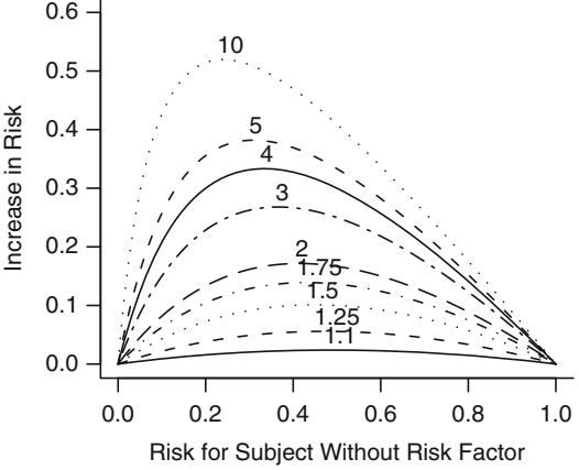 Since odds have an unlimited range, any positive odds ratio will still yield a valid probability. If one attempted to describe an effect by a risk ratio, the effect can only occur over a limited range of risk (probability). For example, a risk ratio of 2 can only apply to risks below .5; above that point the risk ratio must diminish. (Risk ratios are similar to odds ratios if the risk is small.) Risk differences have the same difficulty; the risk difference cannot be constant and must depend on the initial risk. Odds ratios, on the other hand, can describe an effect over the entire range of risk. An odds ratio can, for example, describe the effect of a treatment independently of covariables affecting risk. Figure 10.2 depicts the relationship between risk of a subject without the risk factor and the increase in risk for a variety of relative increases (odds ratios). It demonstrates how absolute risk increase is a function of the baseline risk. Risk increase will also be a function of factors that interact with the risk factor, that is, factors that modify its relative effect. Once a model is developed for estimating Prob{Y = 1|X}, this model can easily be used to estimate the absolute risk increase as a function of baseline risk factors as well as interacting factors. Let X1 be a binary risk factor and let A = {X2,…,Xp} be the other factors (which for convenience we assume do not interact with X1). Then the estimate of Prob{Y = 1|X1 = 1, A} × Prob{Y = 1|X1 = 0, A} is