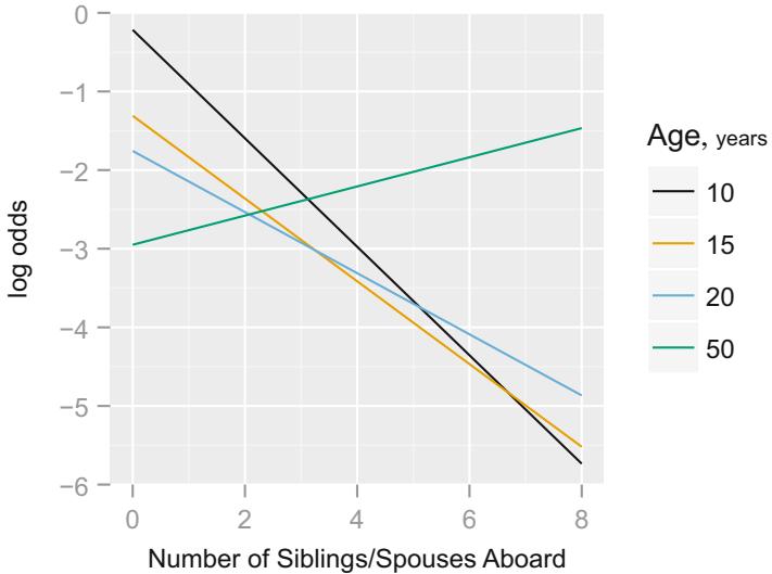 \[\begin{aligned} \text{logit}\{Y=1|X\_1=0, X\_2\} &= \beta\_0 + \beta\_2 X\_2\\ \text{logit}\{Y=1|X\_1=1, X\_2\} &= \beta\_0 + \beta\_1 + \beta\_2 X\_2 + \beta\_3 X\_2\\ &= \beta\_0' + \beta\_2' X\_2, \end{aligned} \tag{10.19}\]