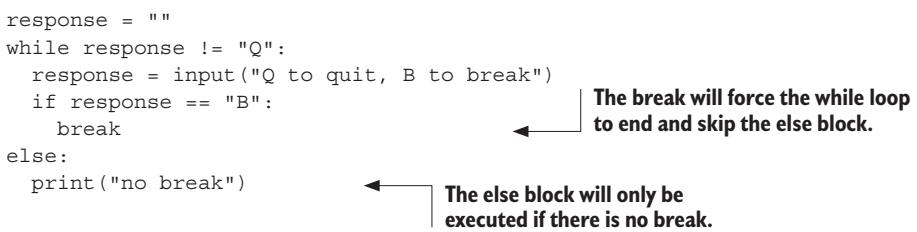 Python doesn’t use braces to indicate code structure; instead, the indentation itself is used. The last two lines of the previous code are the body of the while loop because they come immediately after the while statement and are indented one level further than the while statement. If those lines weren’t indented, they wouldn’t be part of the body of the while.