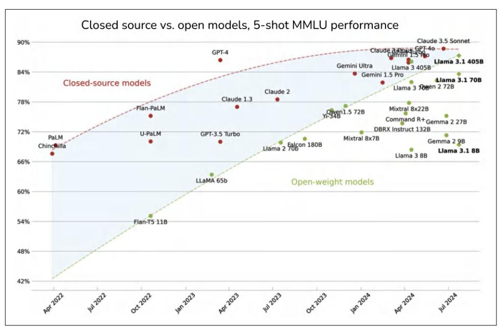 Figure 4-7. The gap between open source models and proprietary models is decreasing on the MMLU benchmark. Image by Maxime Labonne.